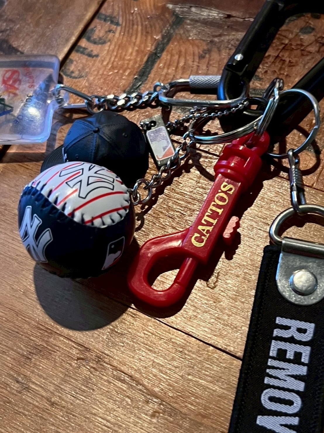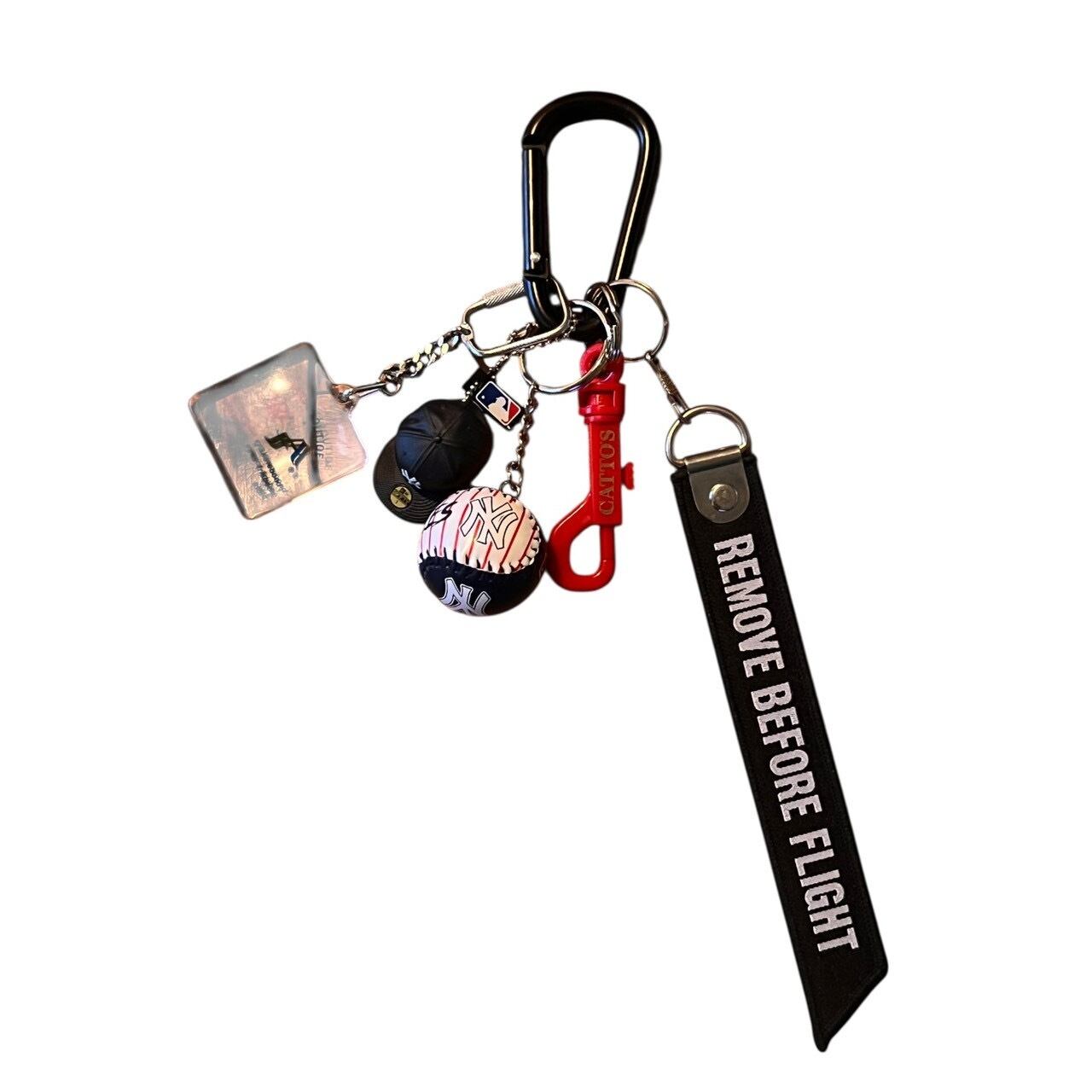 “REMOVE BEFORE FLIGHT”のブラックタグに、New York Yankeesのベースボールチャーム、キャップモチーフ、MLBロゴパーツ、カラビナフックを組み合わせたミックスチャーム。アメリカンベースボールカルチャーを感じさせるモチーフをまとめたデザインです。