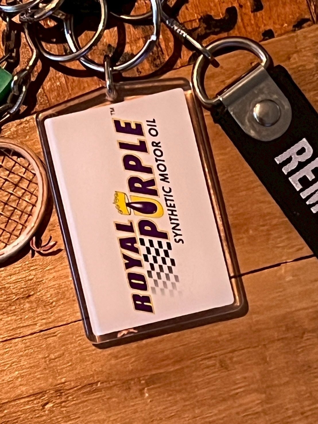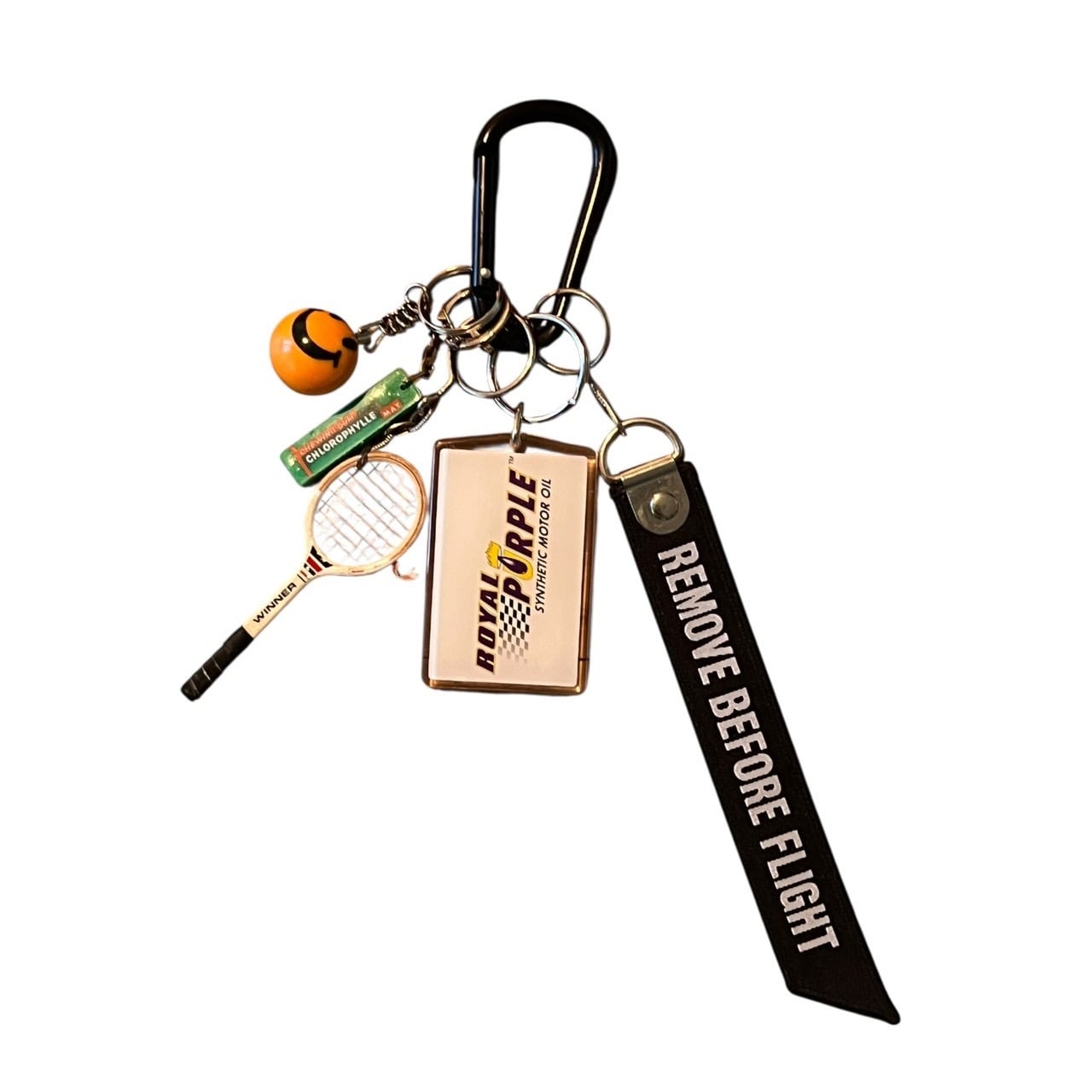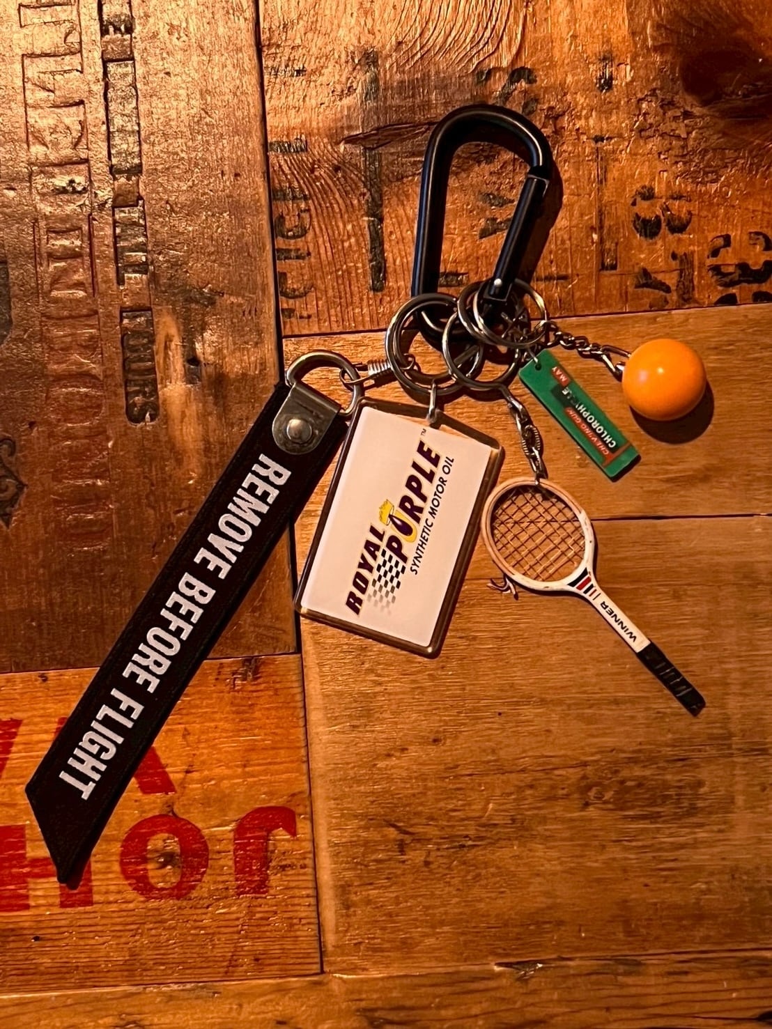 “REMOVE BEFORE FLIGHT”のブラックタグに、テニスラケットチャーム、ヴィンテージモーターオイルのミニケース、スマイルボール、カラビナフックなどを組み合わせたミックスチャーム。