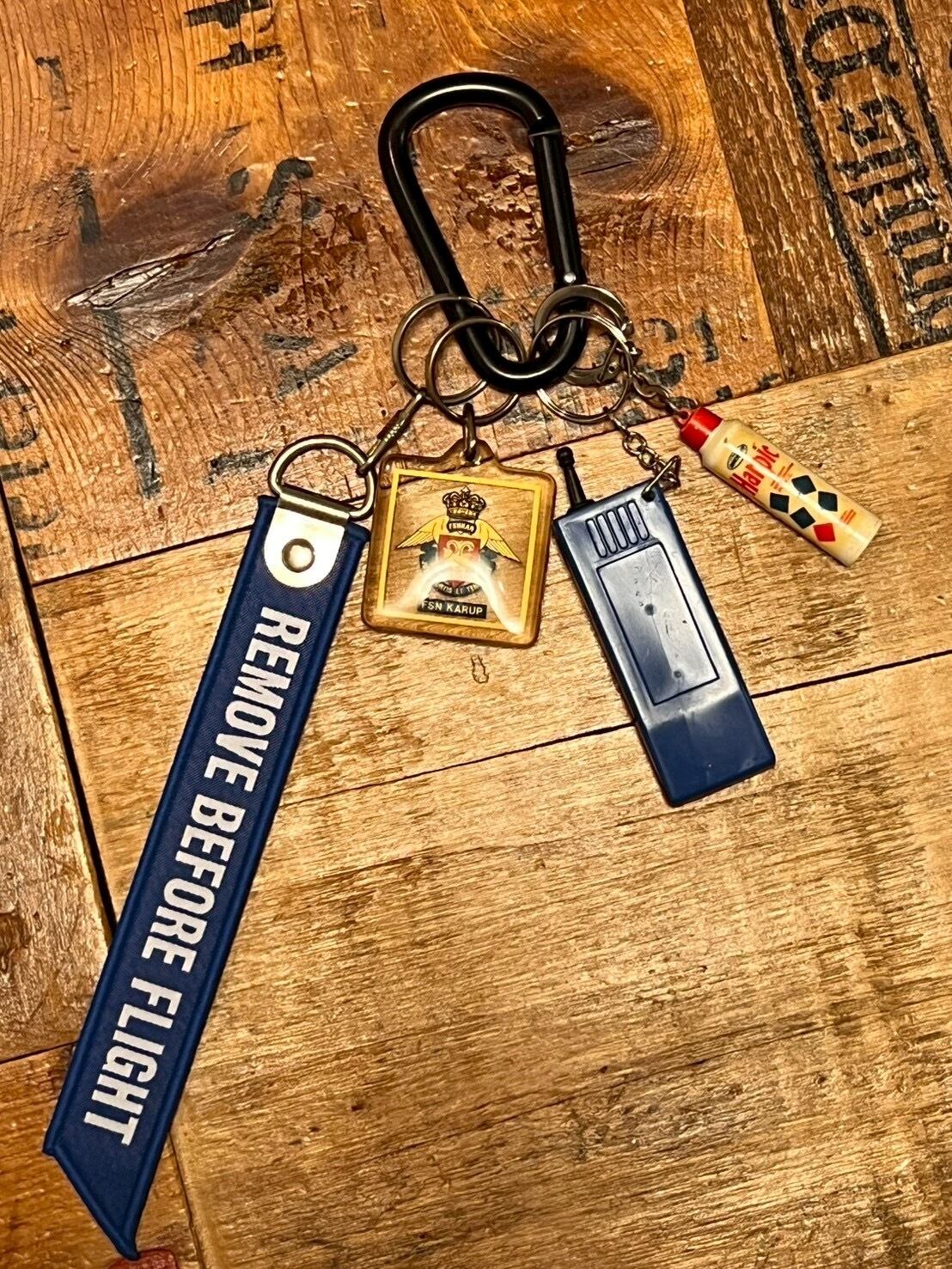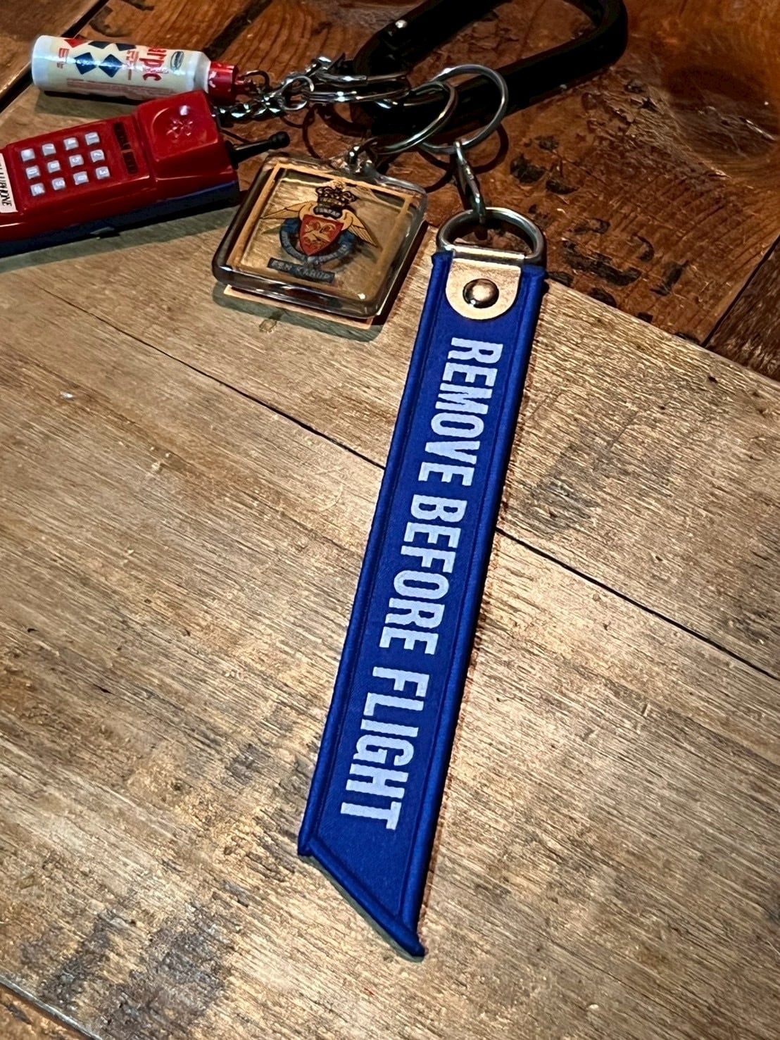 “REMOVE BEFORE FLIGHT”のブルータグに、レトロセルフォンチャーム、ヴィンテージ広告モチーフ、ミリタリーエンブレムタグを組み合わせたミックスチャーム。