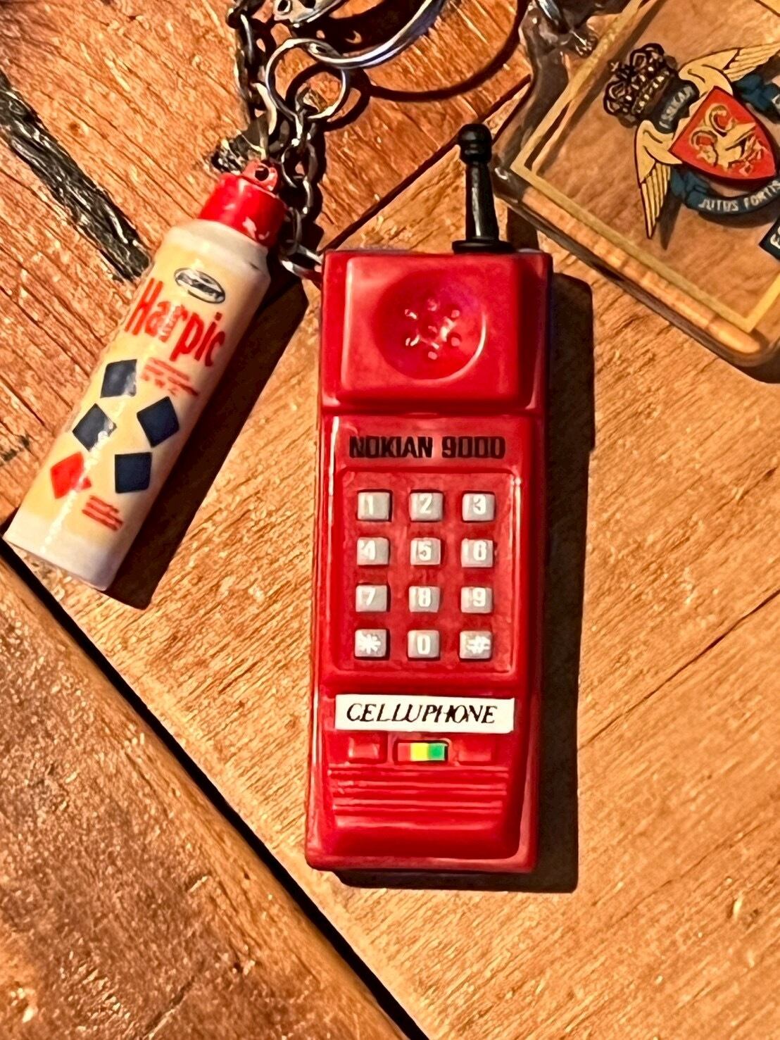 存在感のある赤いレトロ携帯に、クラシックな広告チャームやエンブレムタグが加わり、どこか90’sガジェットの空気を思わせるポップでラフなバランスに仕上がっています。