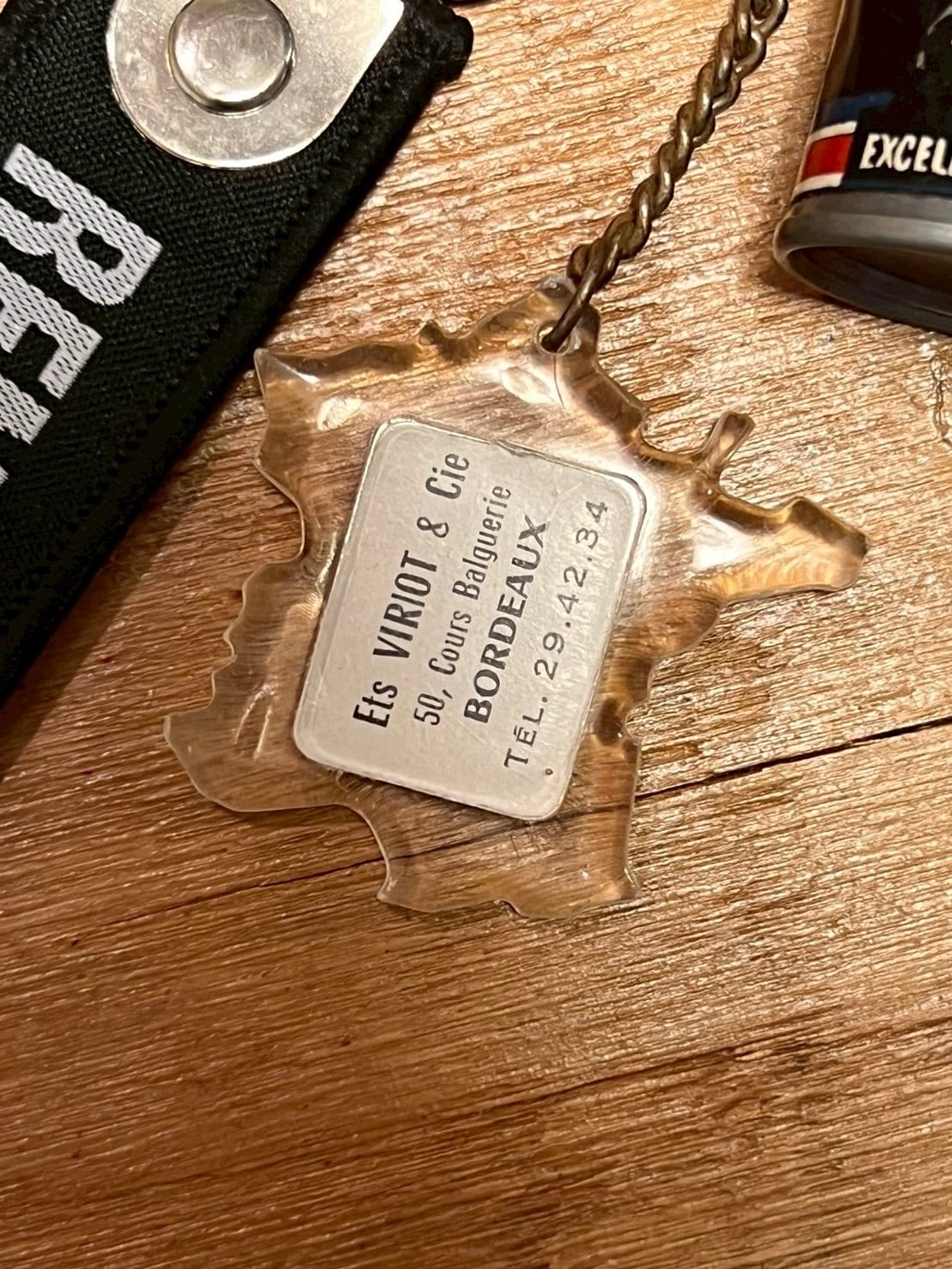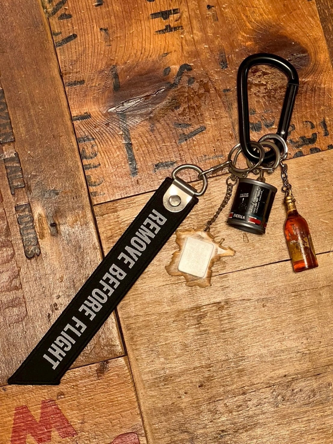 “REMOVE BEFORE FLIGHT”のブラックタグに、ヴィンテージボトル、ビール缶モチーフ、エンブレムチャームを組み合わせたミックスチャーム。アメリカンバーやローカルショップのキーホルダーのような雰囲気を感じるデザインです。