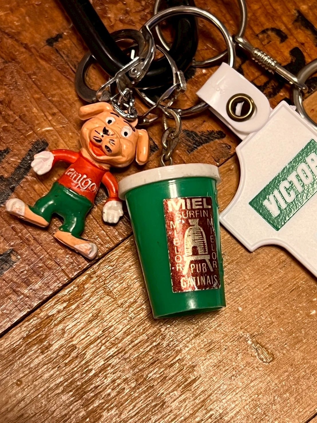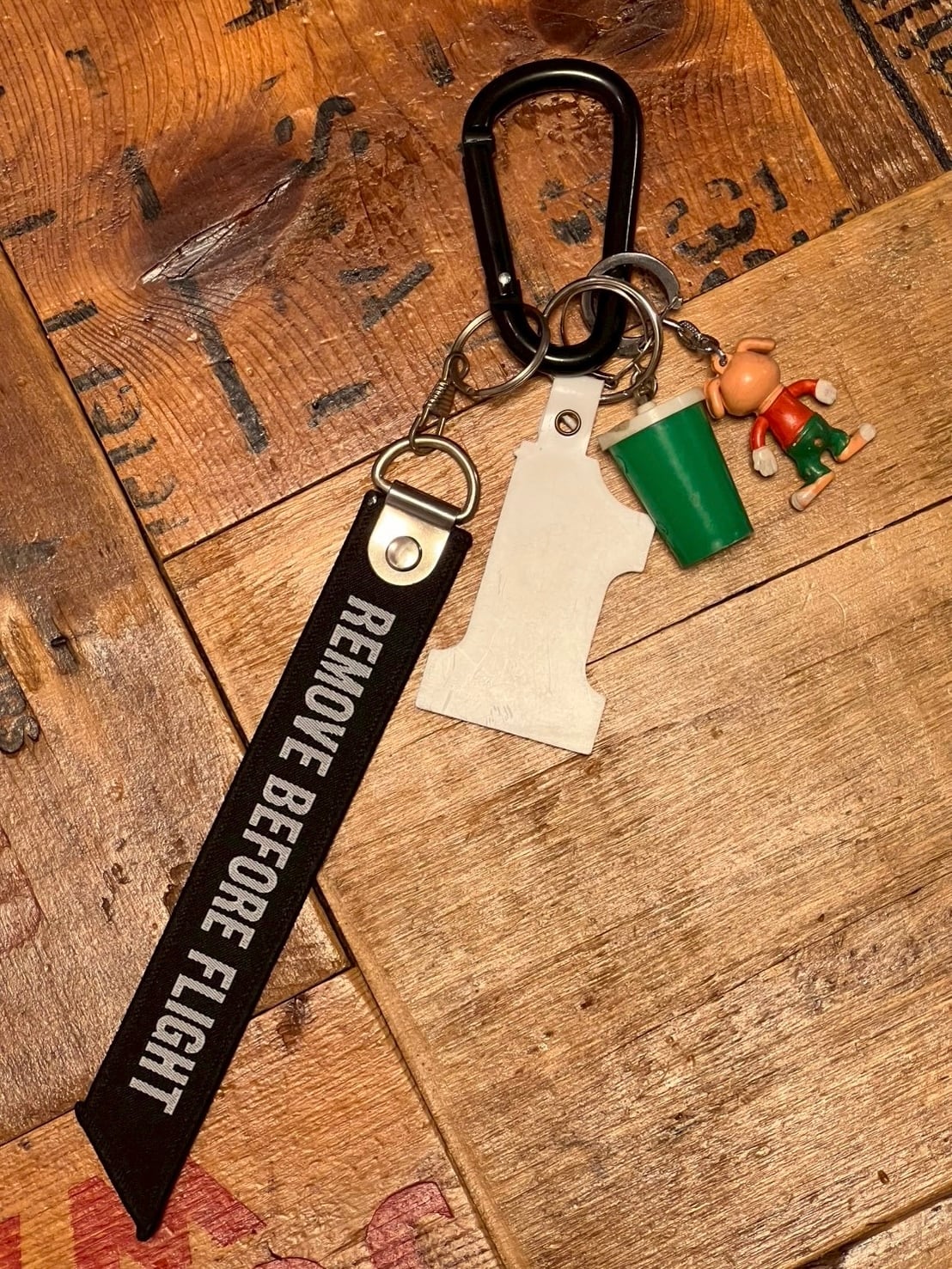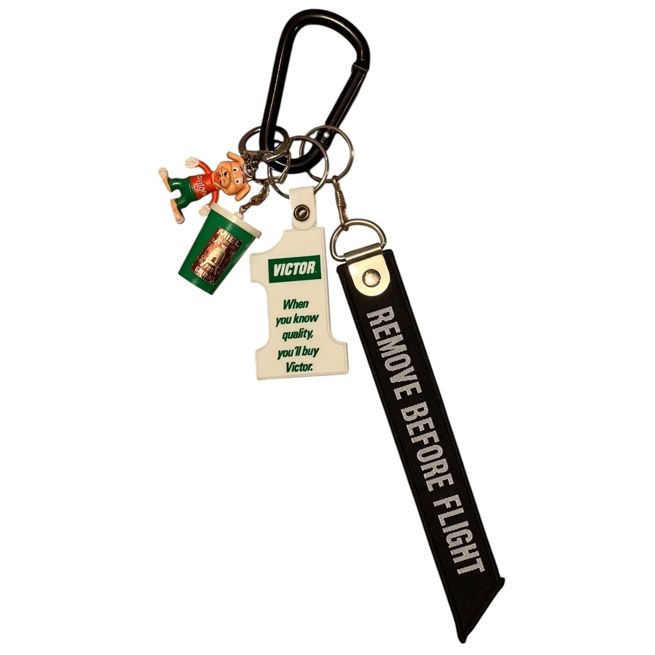 “REMOVE BEFORE FLIGHT”のブラックタグに、Victorのヴィンテージ広告キーホルダー、ポップなキャラクターチャーム、ドリンクカップモチーフを組み合わせたミックスチャーム。アメリカン広告雑貨の雰囲気を感じるデザインです。