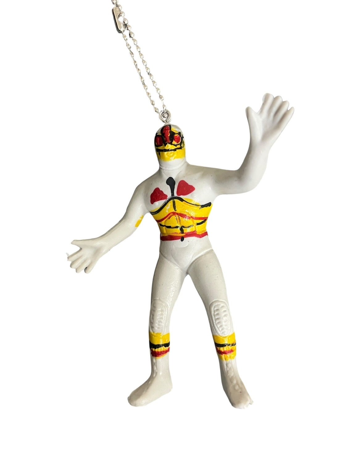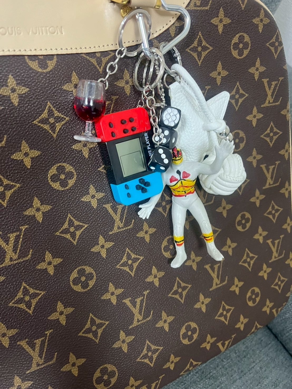 ルチャ・リブレのマスクマン、ゲーム機、ダイス、ワイングラスなどを組み合わせたミックスキーチャーム。
