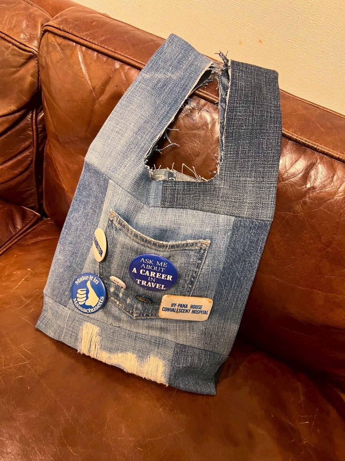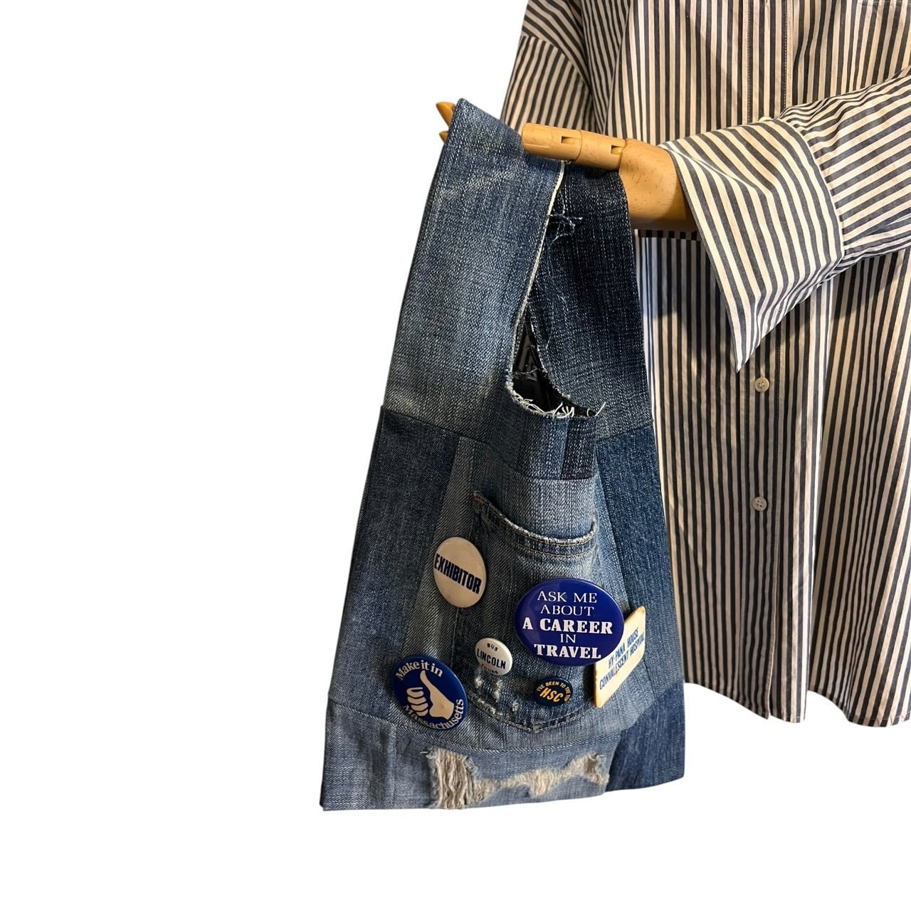 フロントにはデニムポケットをそのまま活かし、ヴィンテージの缶バッジをアクセントとして配置。