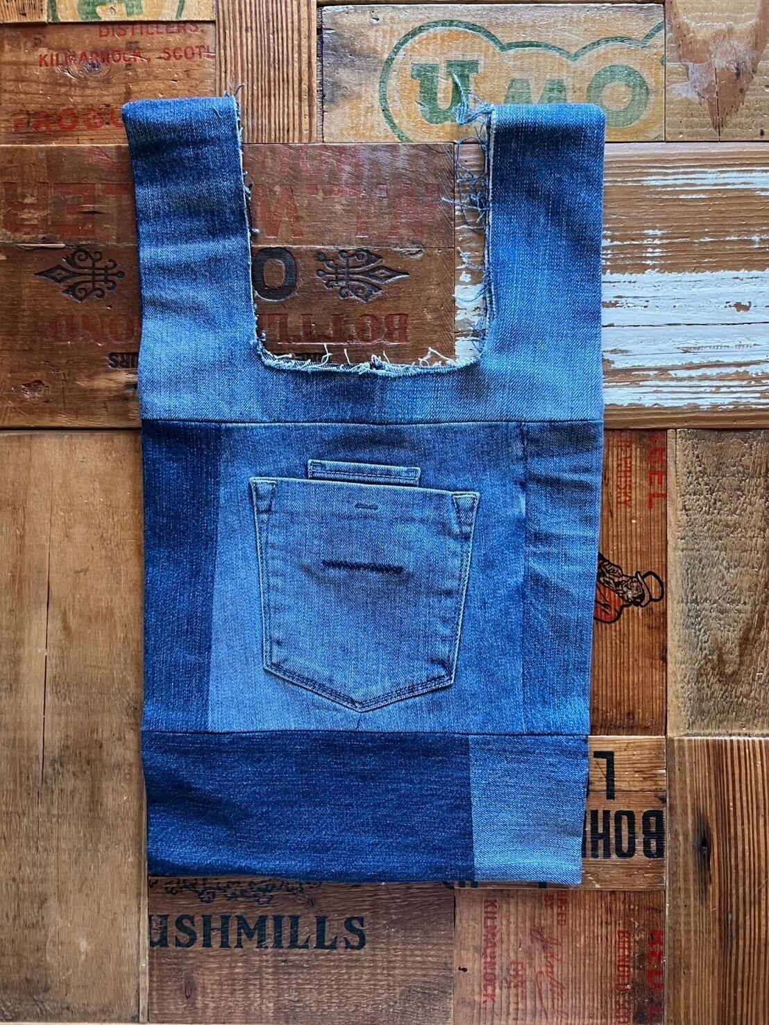 古着のデニムを数本使い、パッチワーク状に仕立てたリメイクエコバッグ。