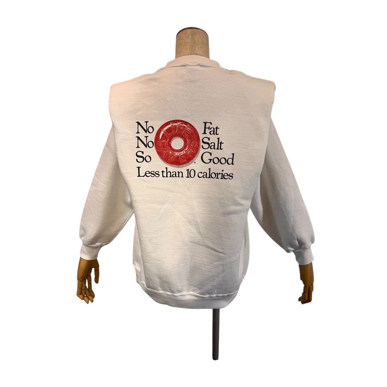 “LIFESAVERS”のグラフィックスウェットを、構築的なパワーショルダー仕様に再構築した一着。