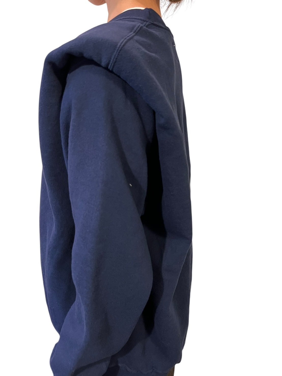 ネイビーボディのスウェットをベースに、構築的なパワーショルダー仕様へ再構築した一着。