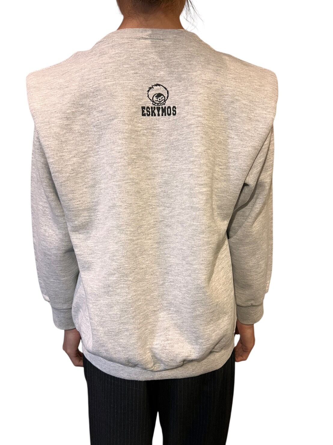 “ESCANABA EHS ESKYMOS”のカレッジスウェットを、構築的なパワーショルダー仕様に再構築した一着。