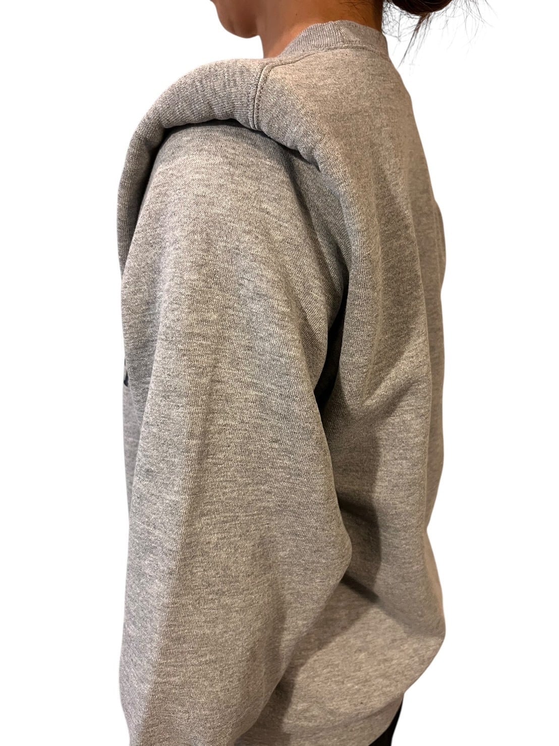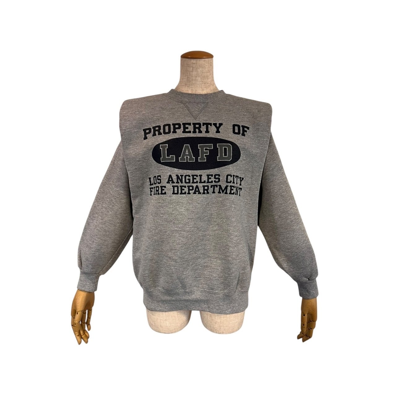 “PROPERTY OF LAFD”のスウェットを、構築的なパワーショルダー仕様に再構築した一着。