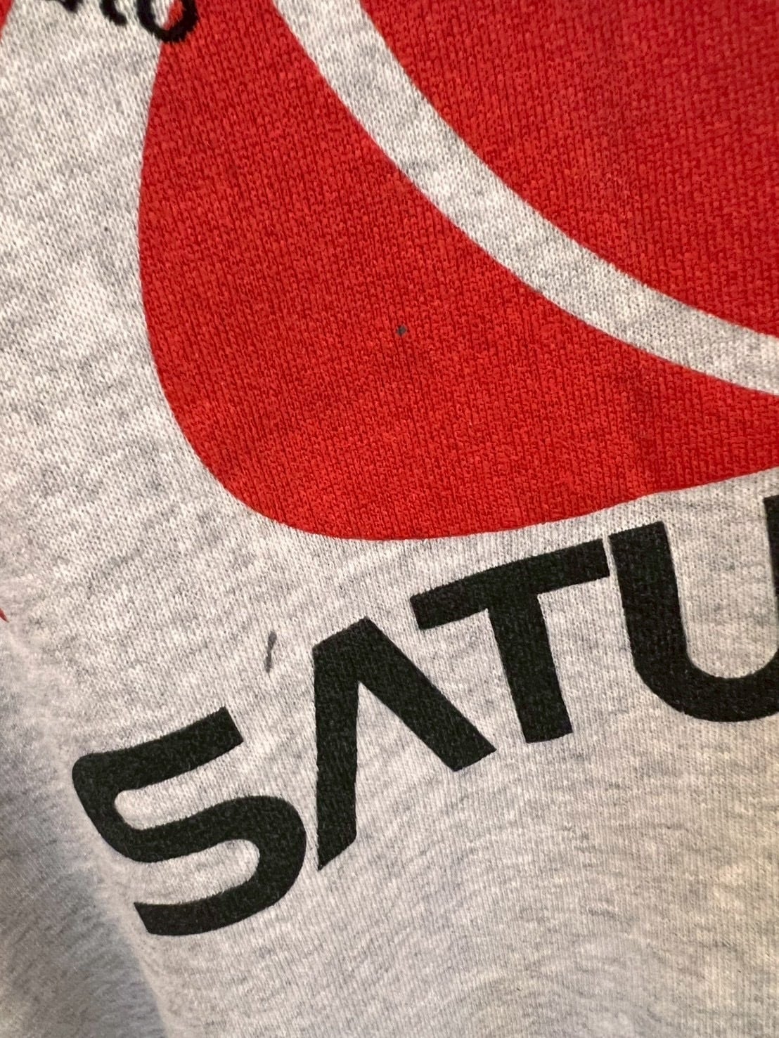 “SATURN”の企業ロゴスウェットをベースに、構築的なパワーショルダー仕様へ再構築した一着。