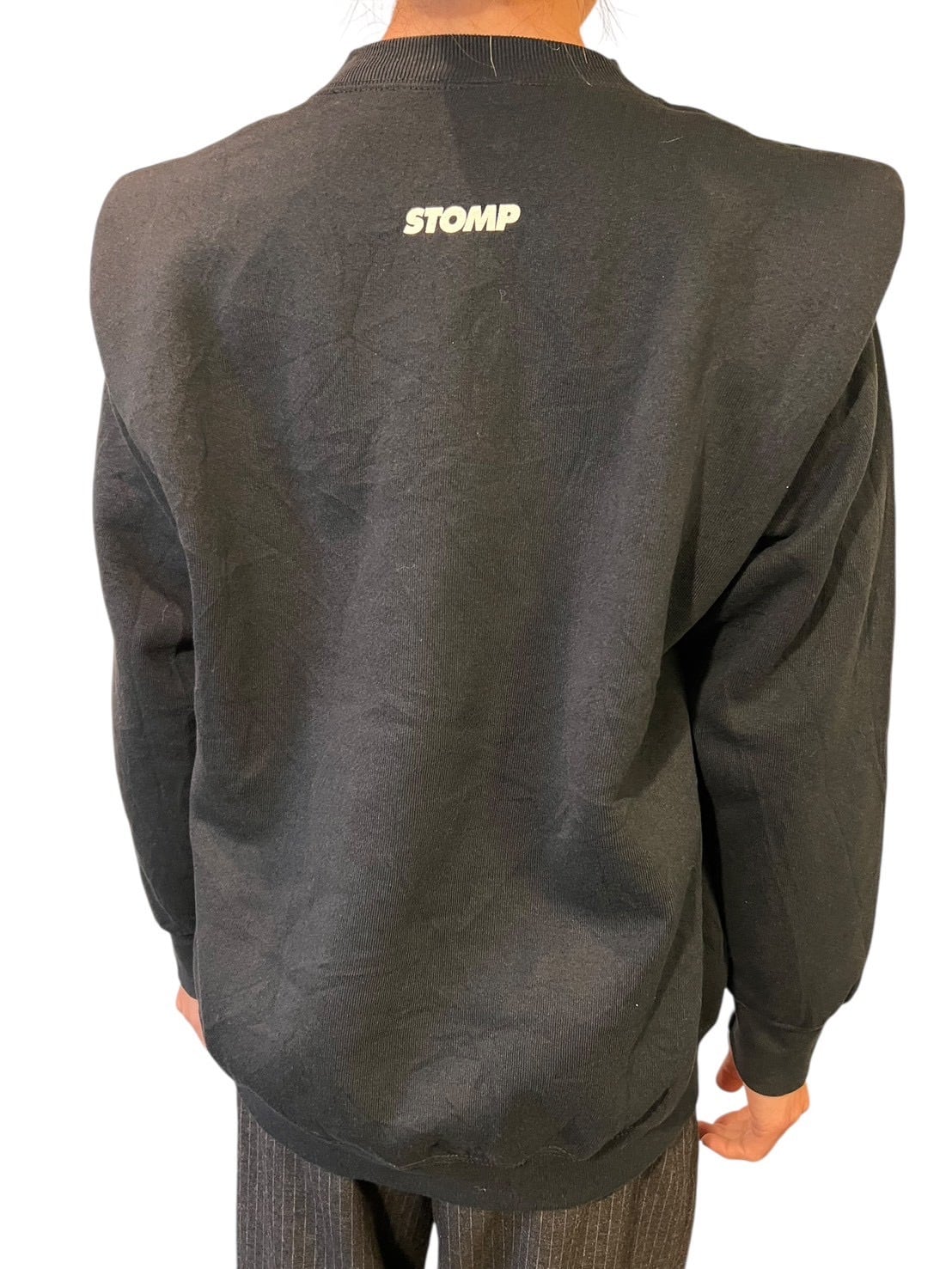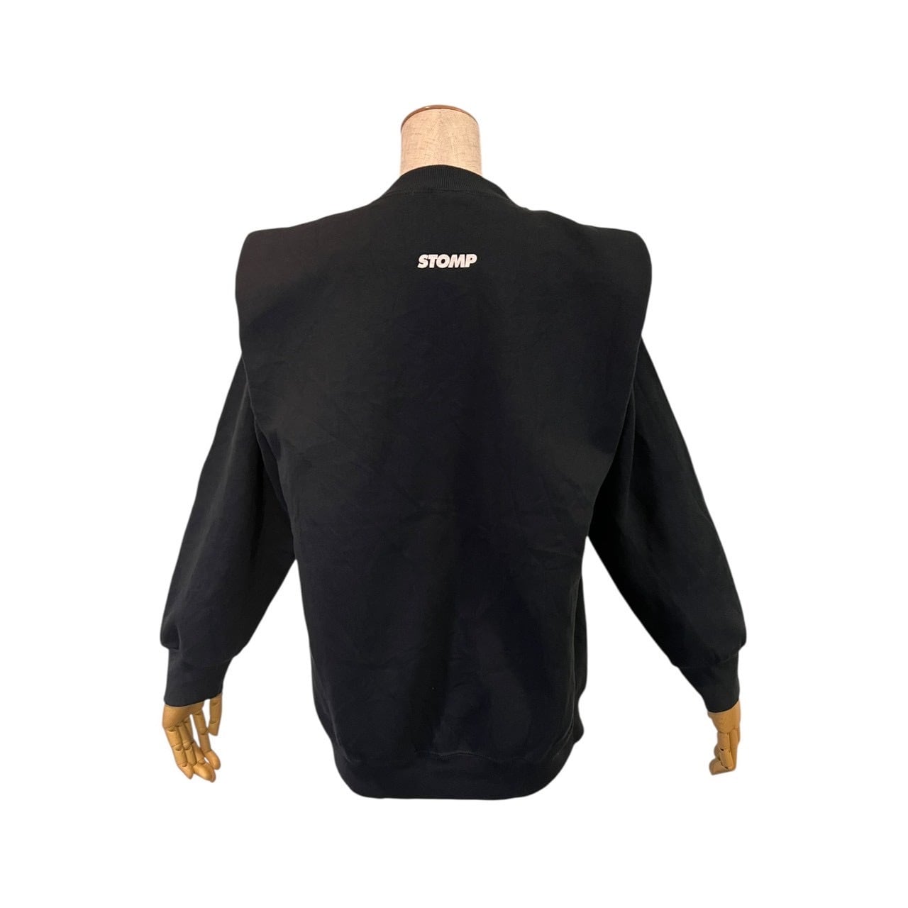 “STOMP”のグラフィックスウェットを、構築的なパワーショルダー仕様に再構築した一着。