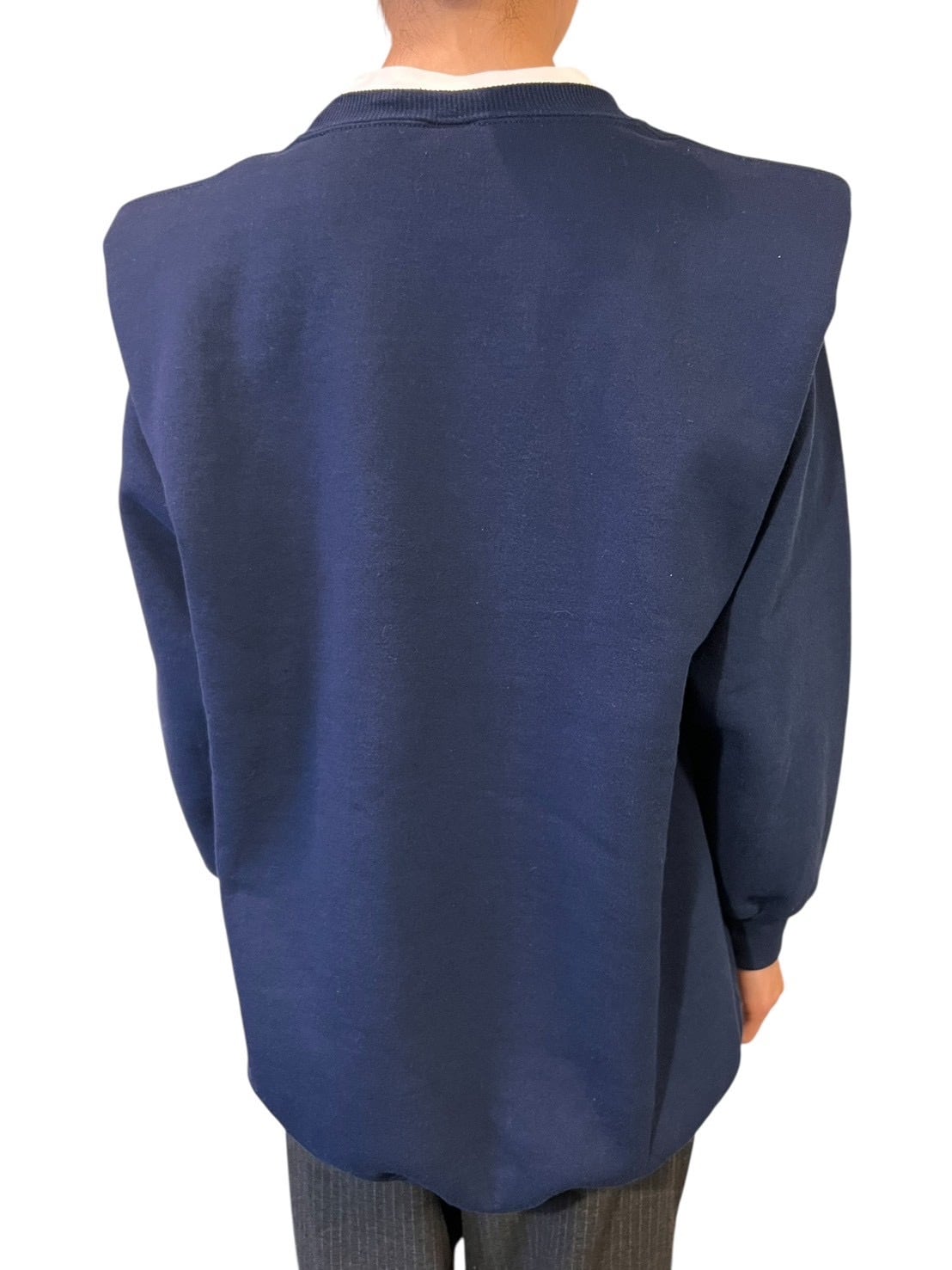 ネイビーボディにワンポイントのカレッジロゴを配したスウェットを、構築的なパワーショルダー仕様に再構築。