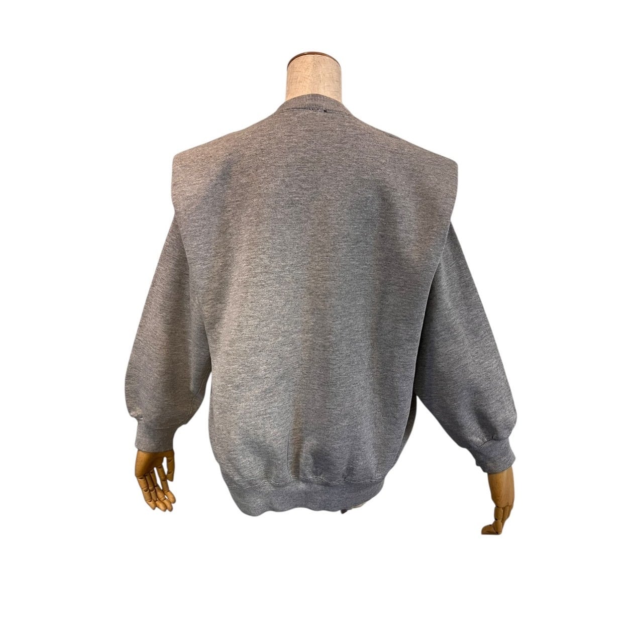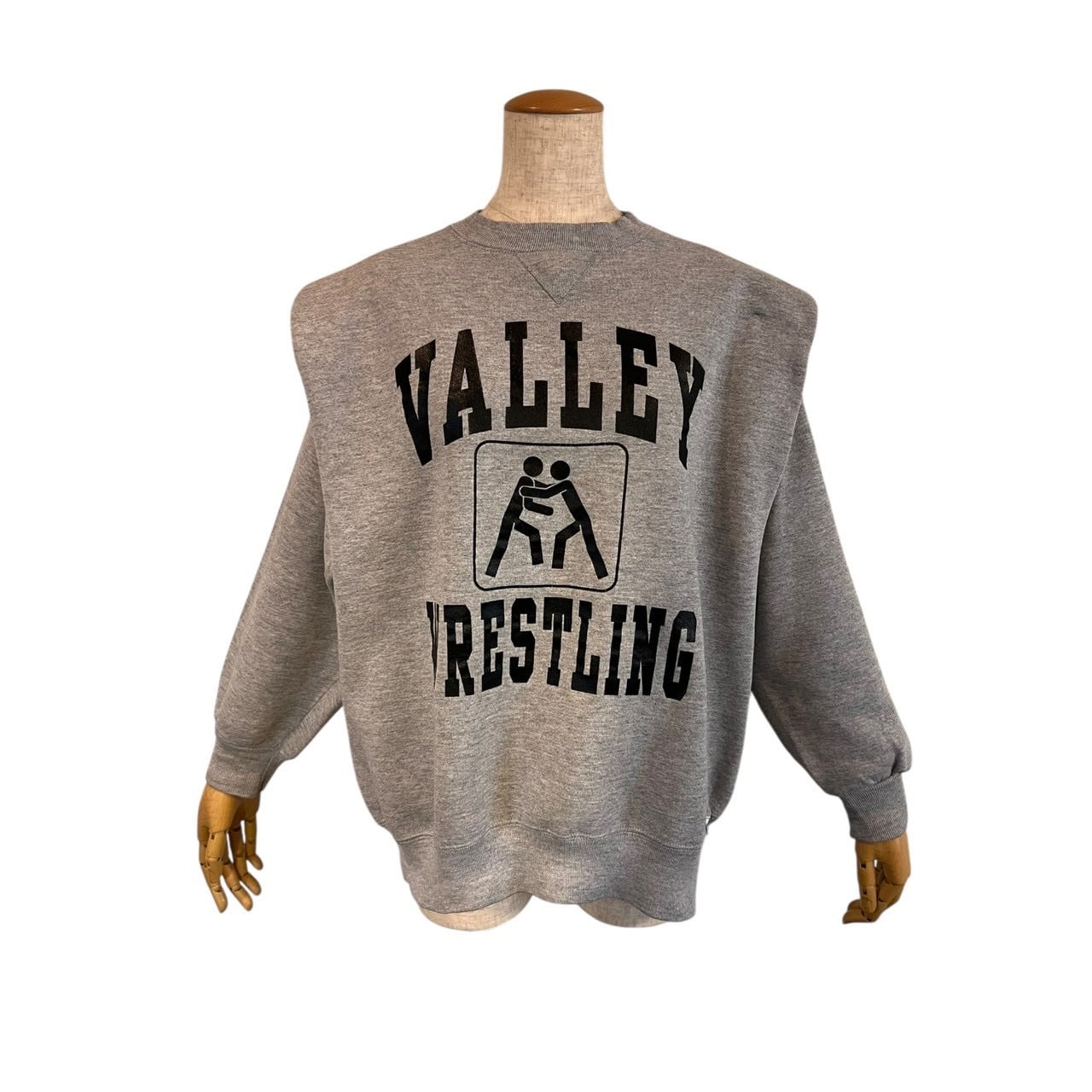 杢グレーボディに“VALLEY WRESTLING”のカレッジロゴを配したスウェットを、構築的なパワーショルダー仕様に再構築。