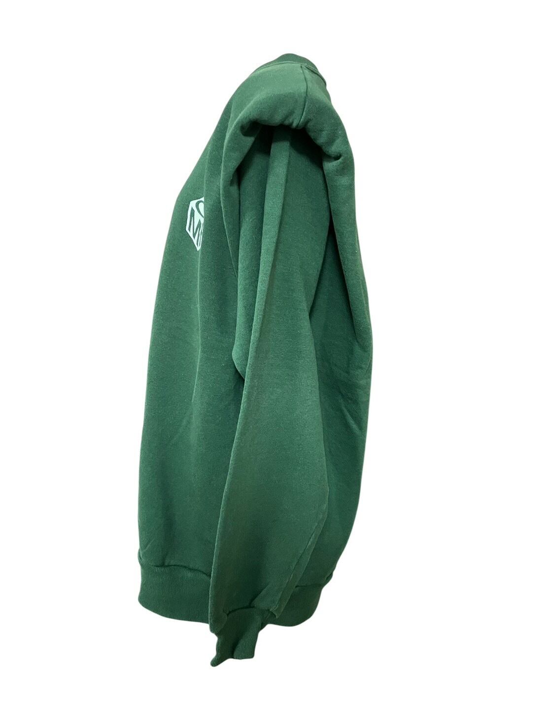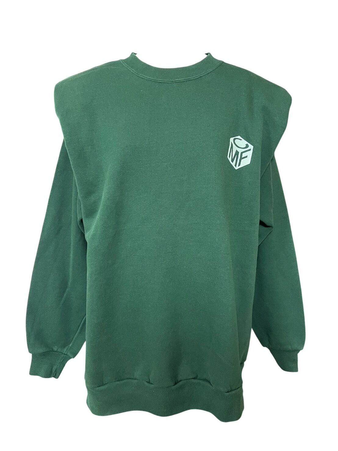 深みのあるグリーンボディにワンポイントのロゴを配したスウェットを、構築的なパワーショルダー仕様に再構築。