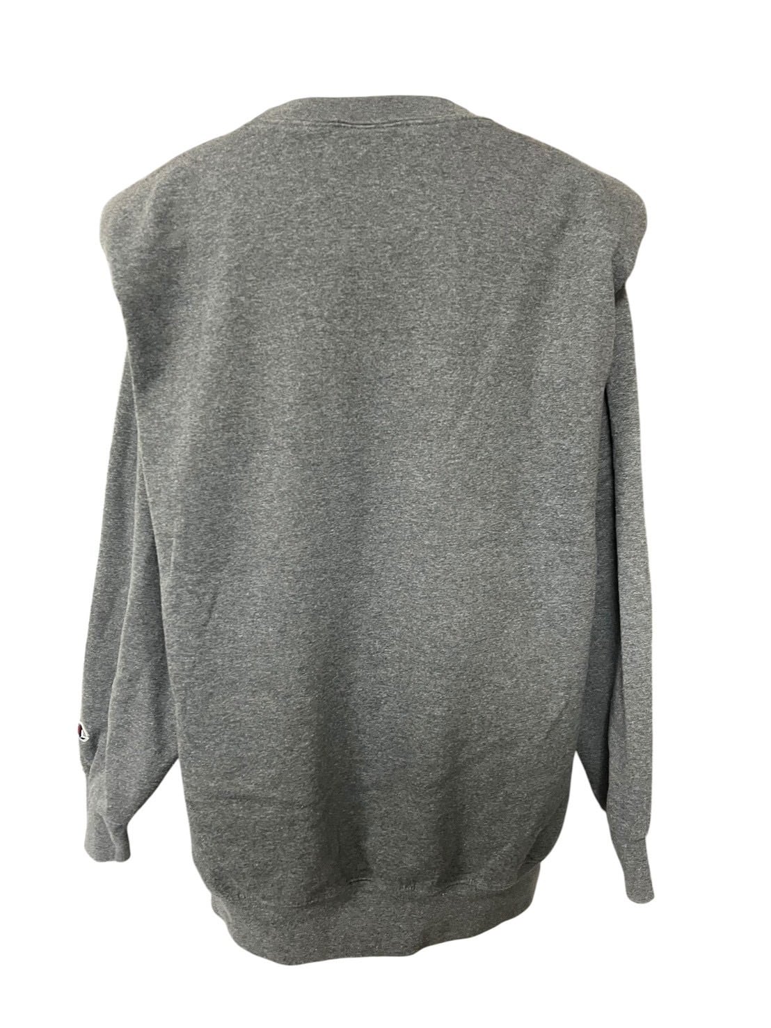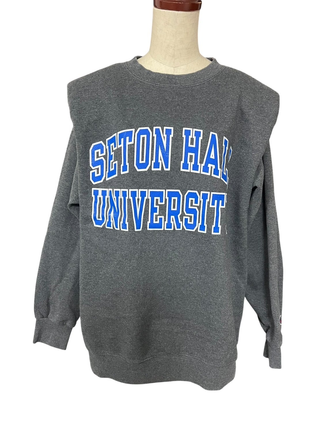 グレーボディに「SETON HALL UNIVERSITY」のカレッジロゴを大胆に配したスウェットを、構築的なパワーショルダー仕様に再構築。