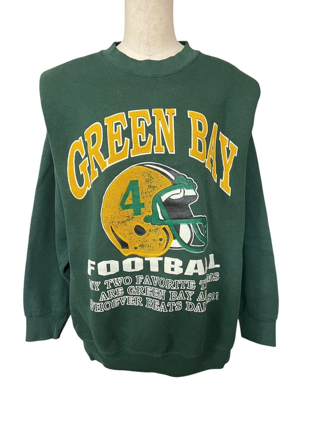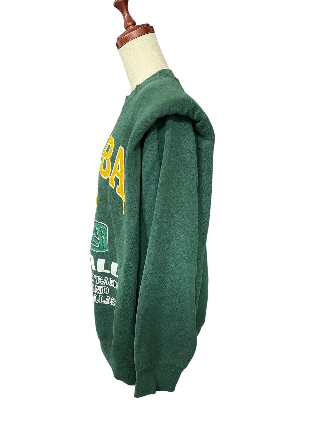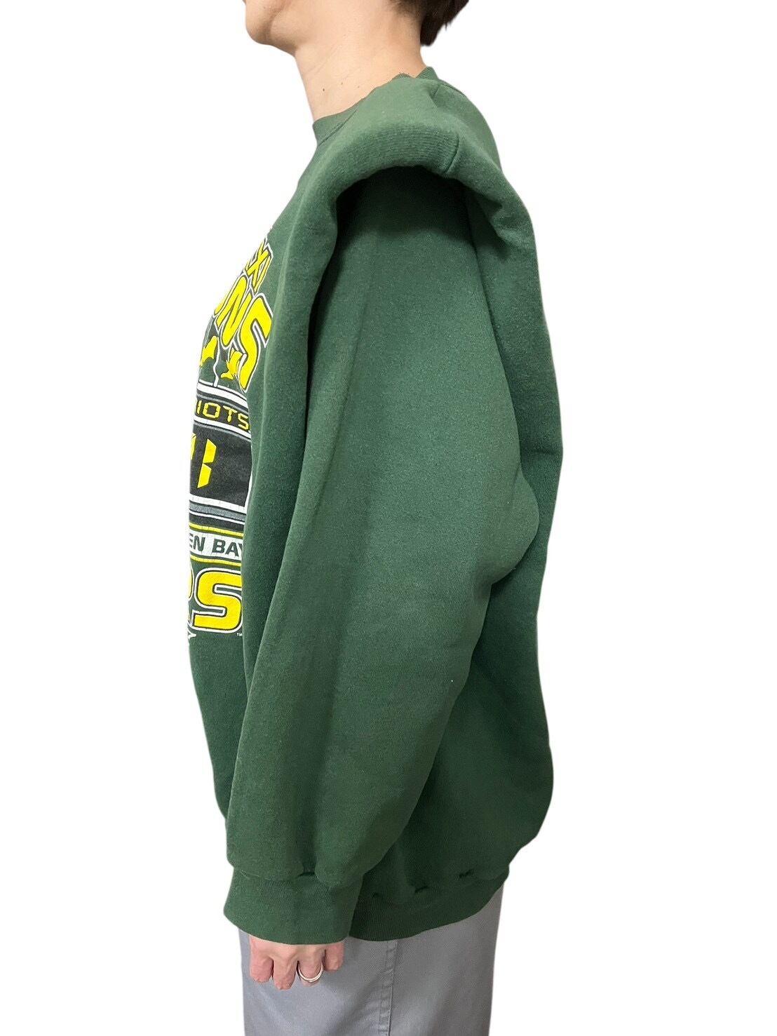 グリーンボディに「GREEN BAY FOOTBALL」のグラフィックを大胆に配したスウェットを、構築的なパワーショルダー仕様に再構築。