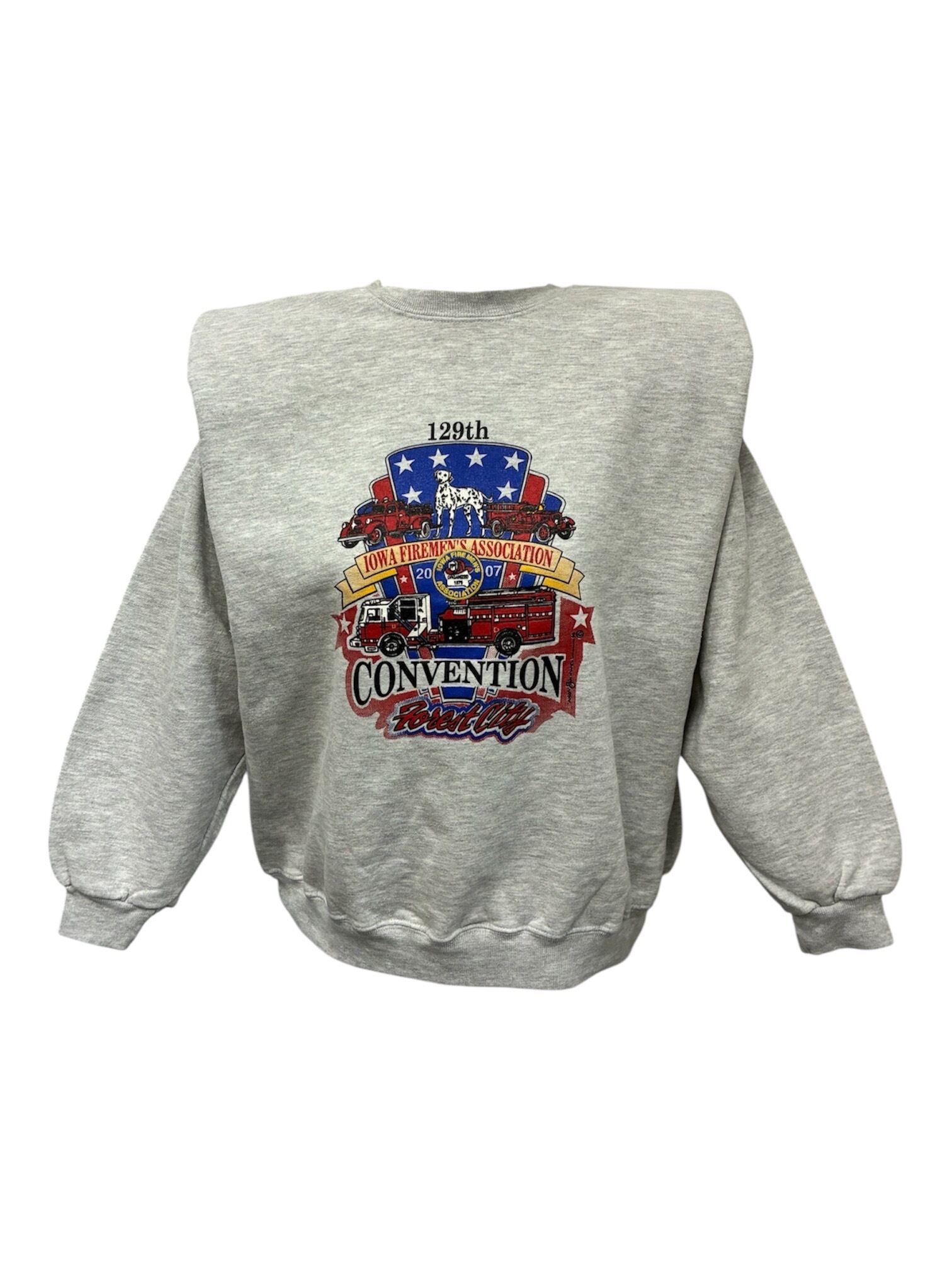 グレーボディに「IOWA FIREMEN’S ASSOCIATION」のコンベンショングラフィックを配したスウェットを、構築的なパワーショルダー仕様に再構築。