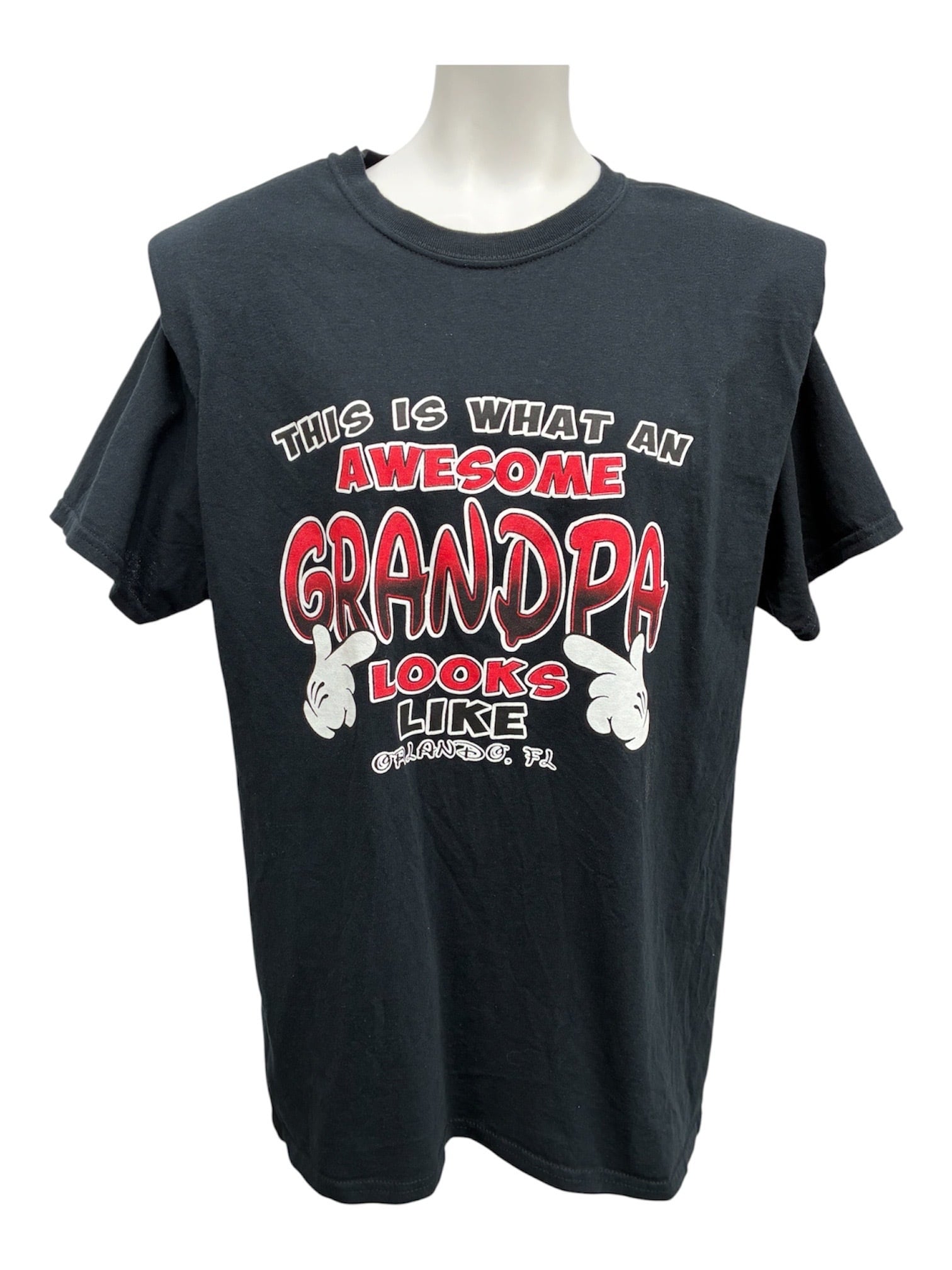 ブラックボディに、“THIS IS WHAT AN AWESOME GRANDPA LOOKS LIKE”のメッセージプリント。指差しのグラフィックも相まって、ユーモアのあるストレートな表現が目を引くデザインです。
