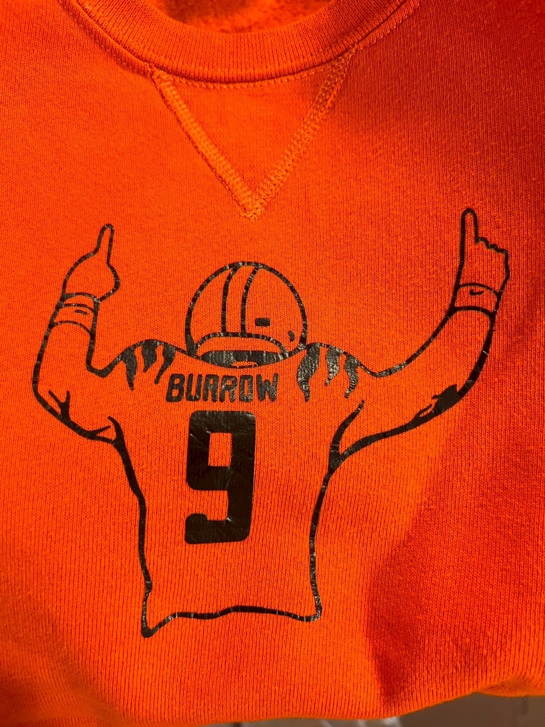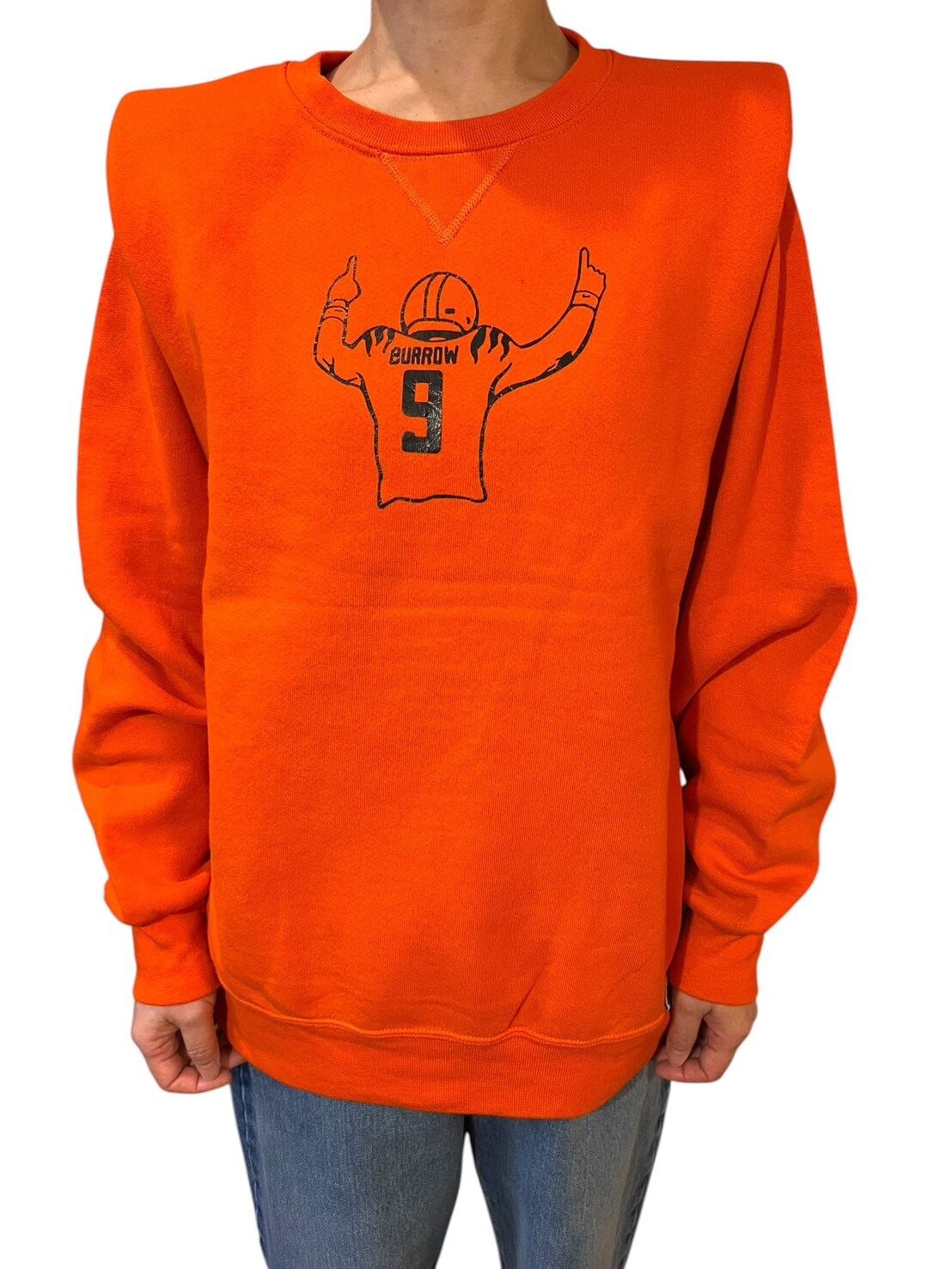 ビビッドなオレンジボディに、背番号「9」とガッツポーズのシルエットを配したスウェットを、構築的なパワーショルダー仕様に再構築。シンプルな線画ながら動きのあるグラフィックで、スポーツモチーフらしい高揚感がしっかり伝わるデザインです。