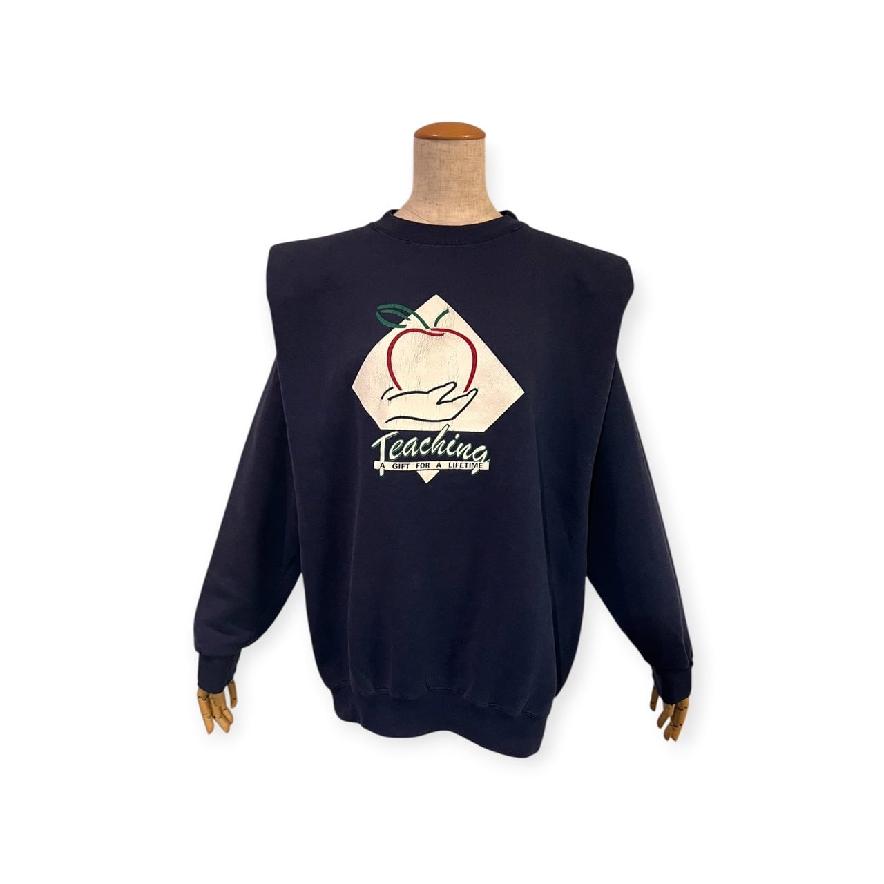 ネイビーボディに、手のひらに乗せたリンゴのグラフィックと「Teaching」のメッセージを配したスウェットを、構築的なパワーショルダー仕様に再構築。どこか温かみのあるモチーフと柔らかな配色で、優しさのある印象に仕上がっています。
