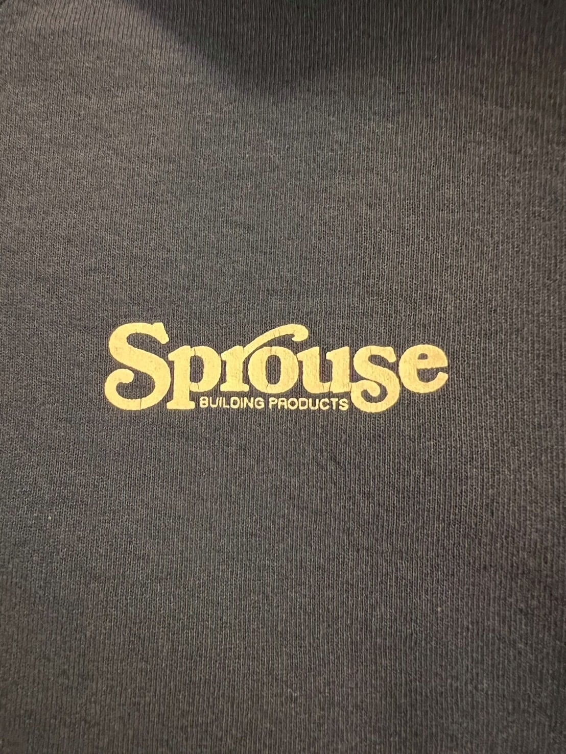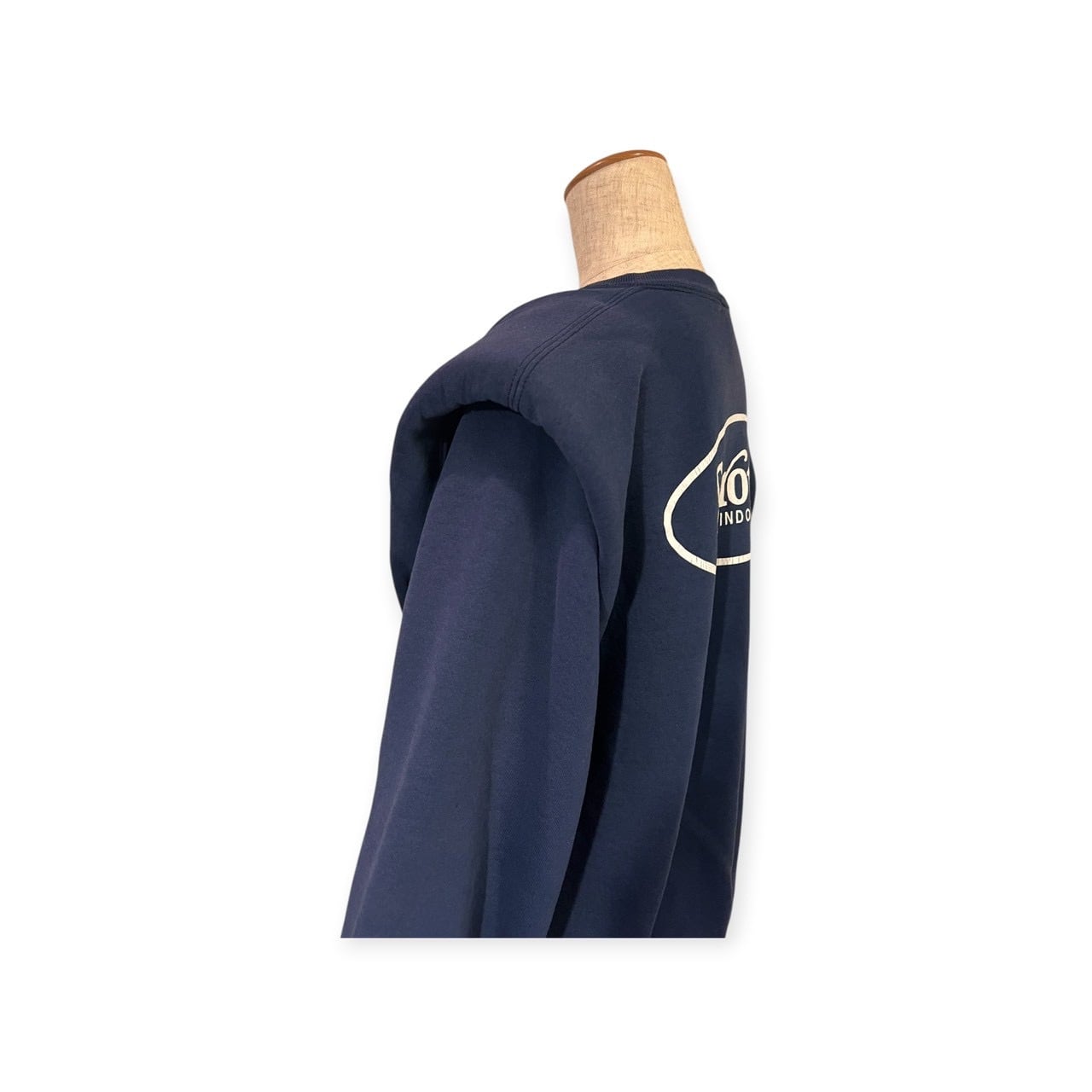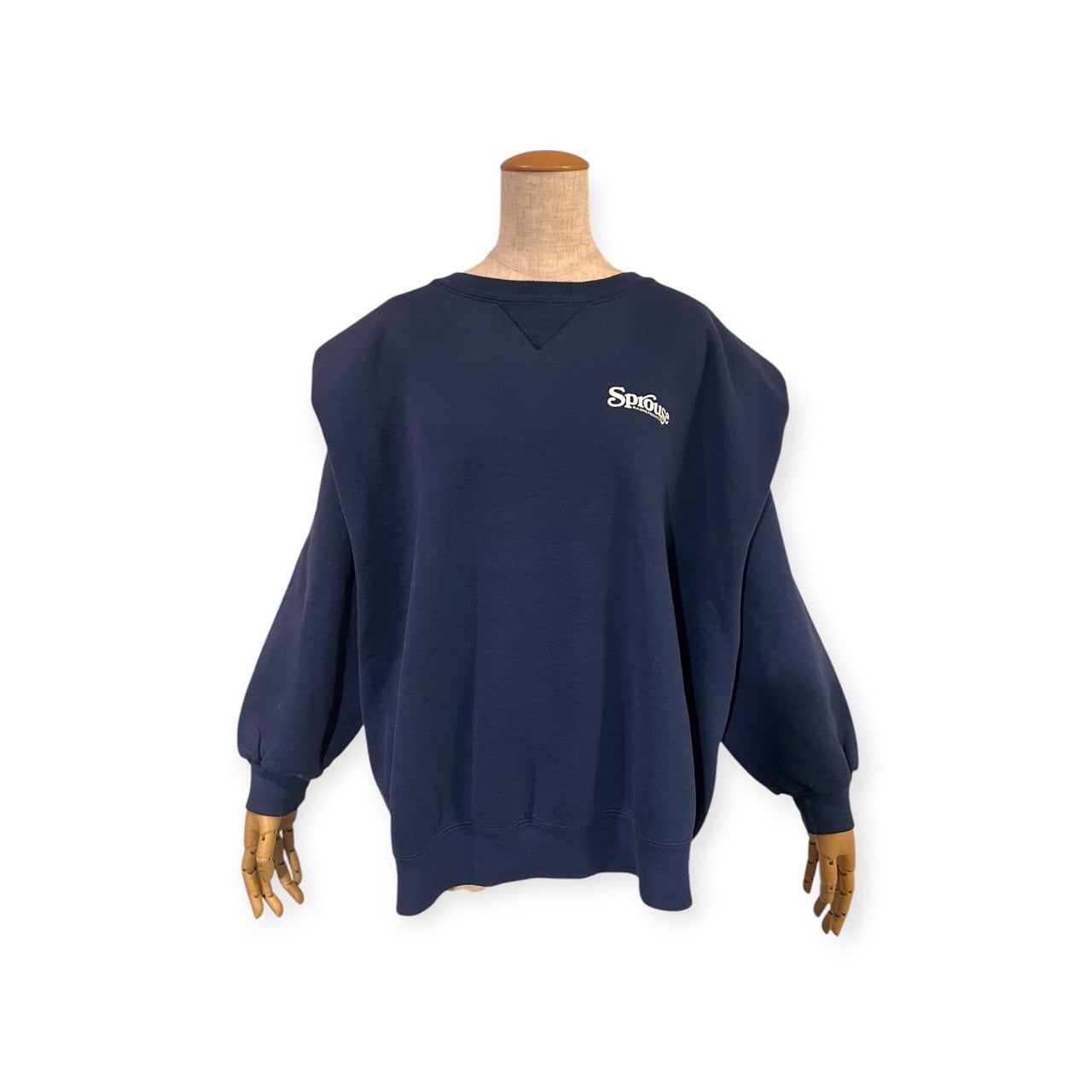 ネイビーボディに、胸元とバックに「Sprouse Windows」のロゴを配したスウェットを、構築的なパワーショルダー仕様に再構築。企業ロゴの無機質さと、シルエットの強さが合わさった一枚です。