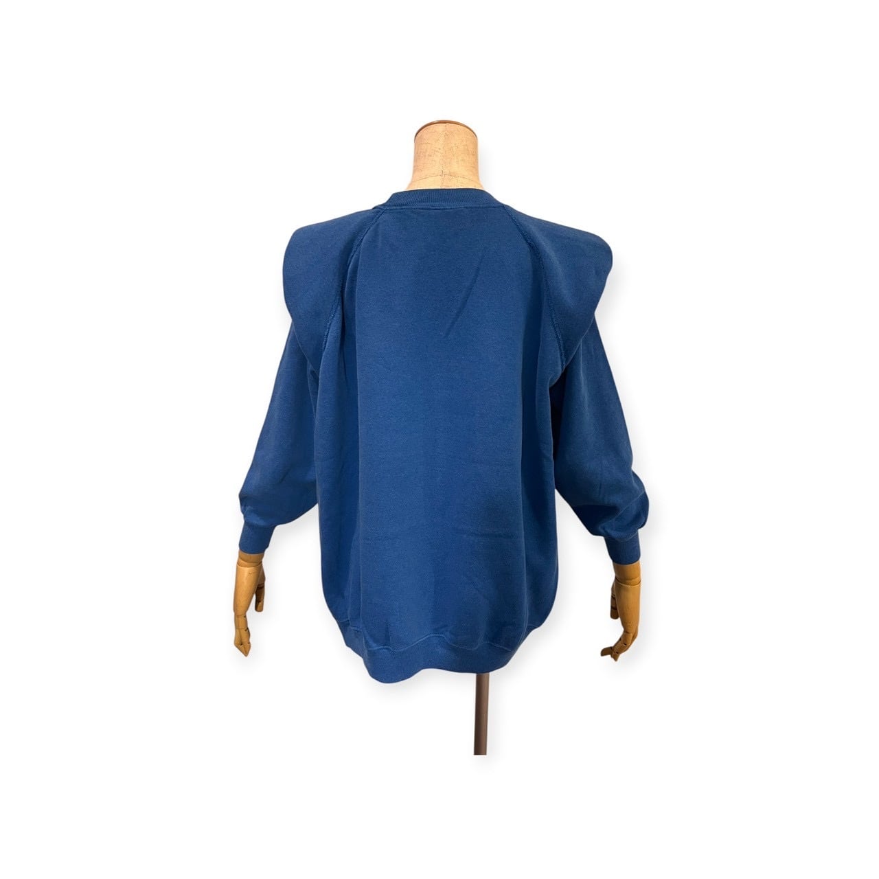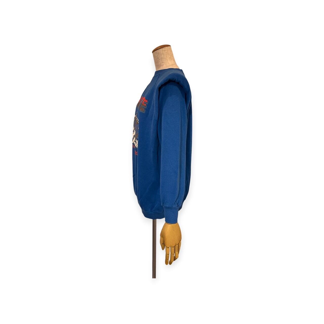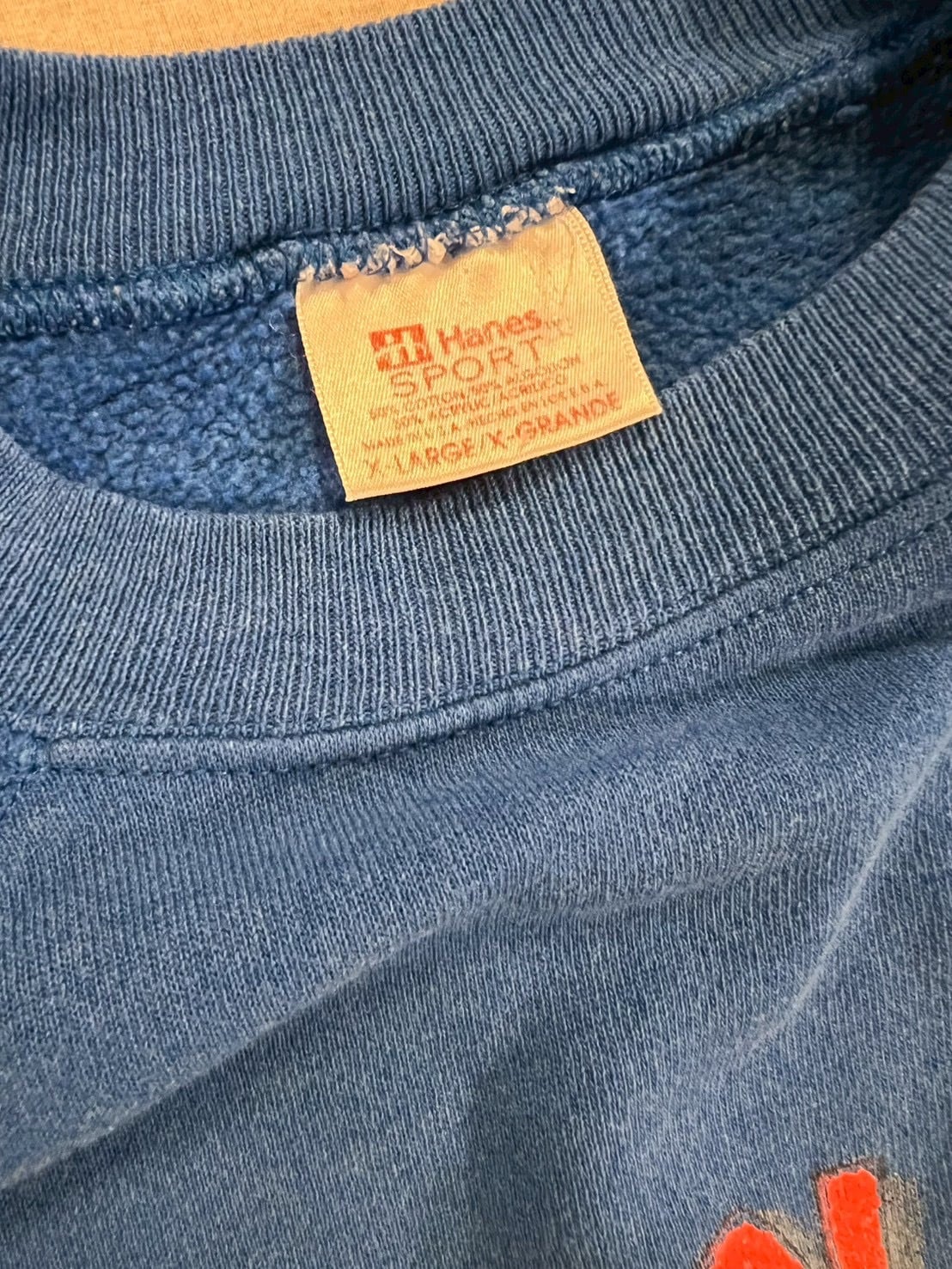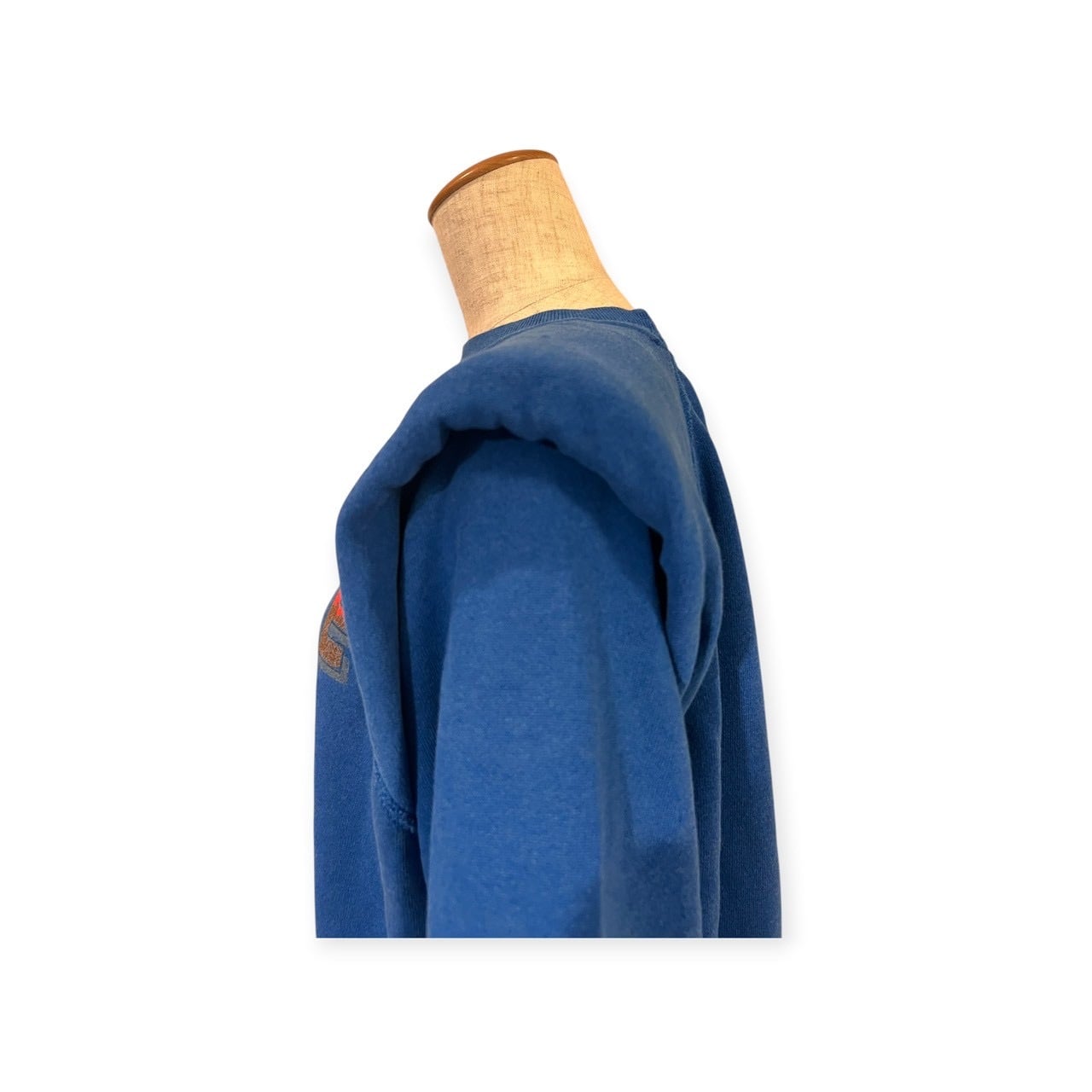 ボディはHanesのスウェットを使用。柔らかく着心地の良い生地感と、程よく色褪せたブルーがヴィンテージらしい雰囲気を演出します。