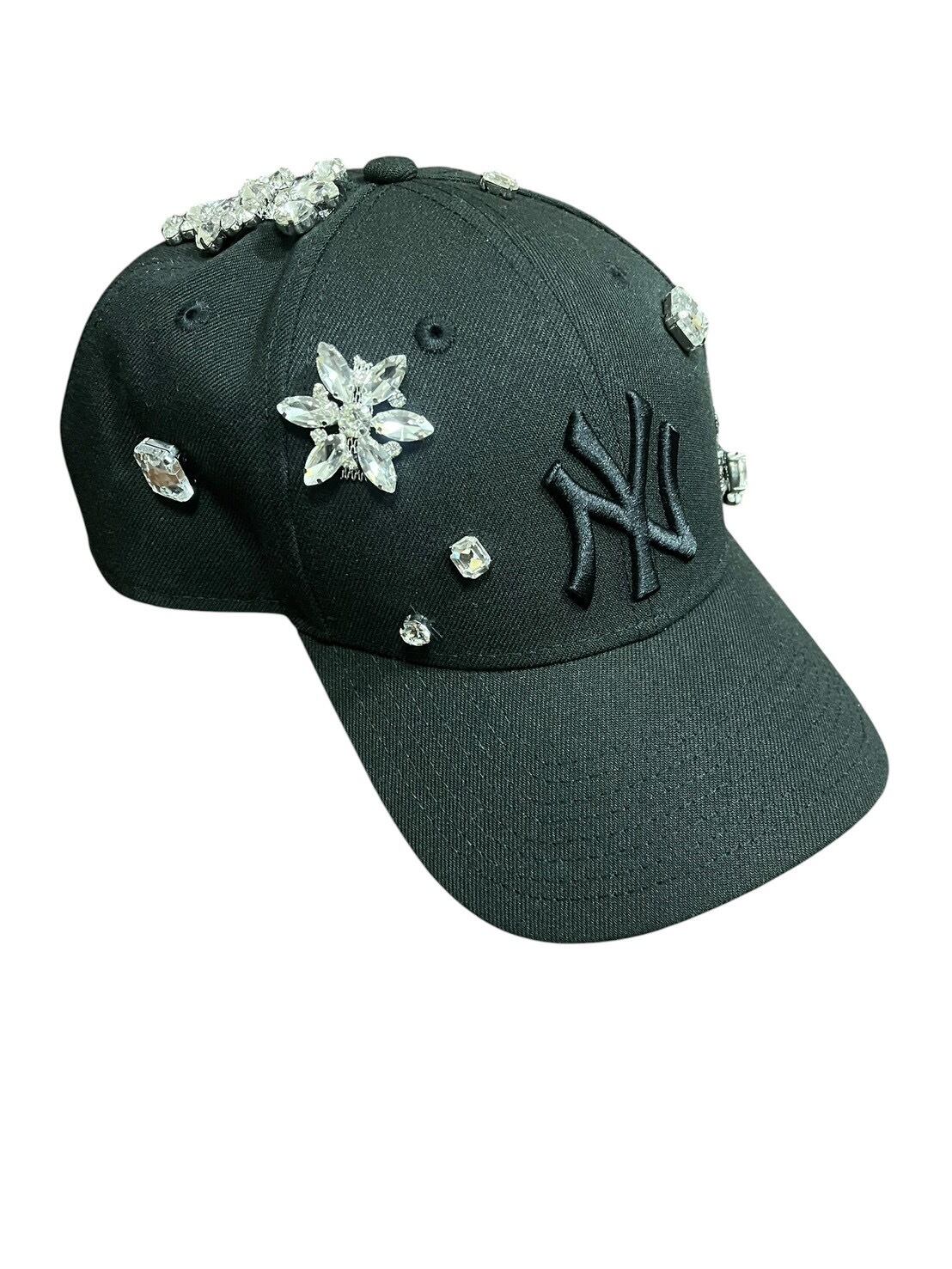 立体的なロゴに、ランダムに散りばめられたビジューとフラワーモチーフが、