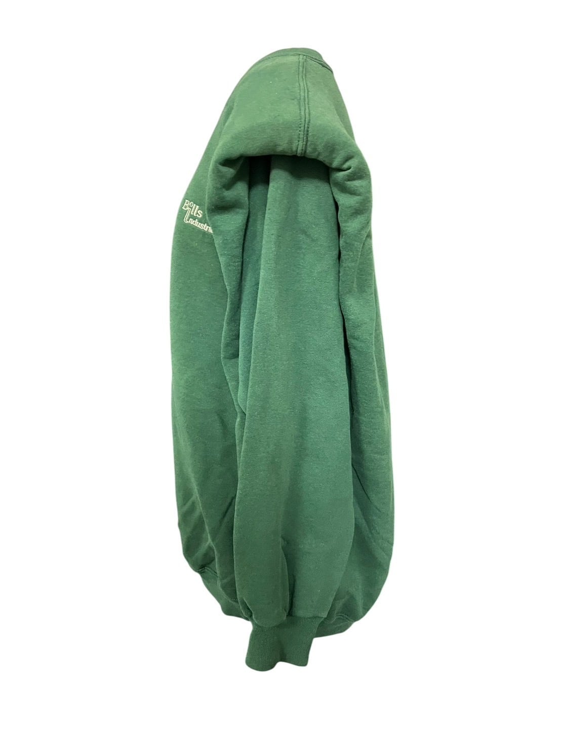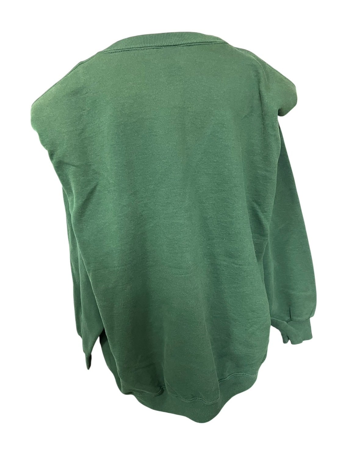 深みのあるグリーンボディにワンポイントの刺繍ロゴを配したスウェットを、構築的なパワーショルダー仕様に再構築。落ち着いた色味とミニマルなデザインが、大人っぽい印象の一枚です。