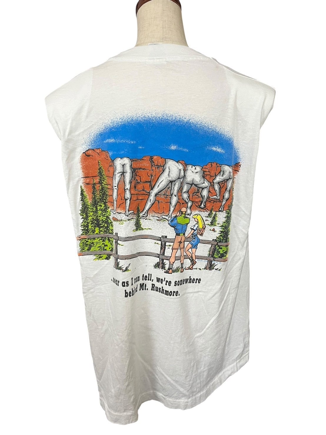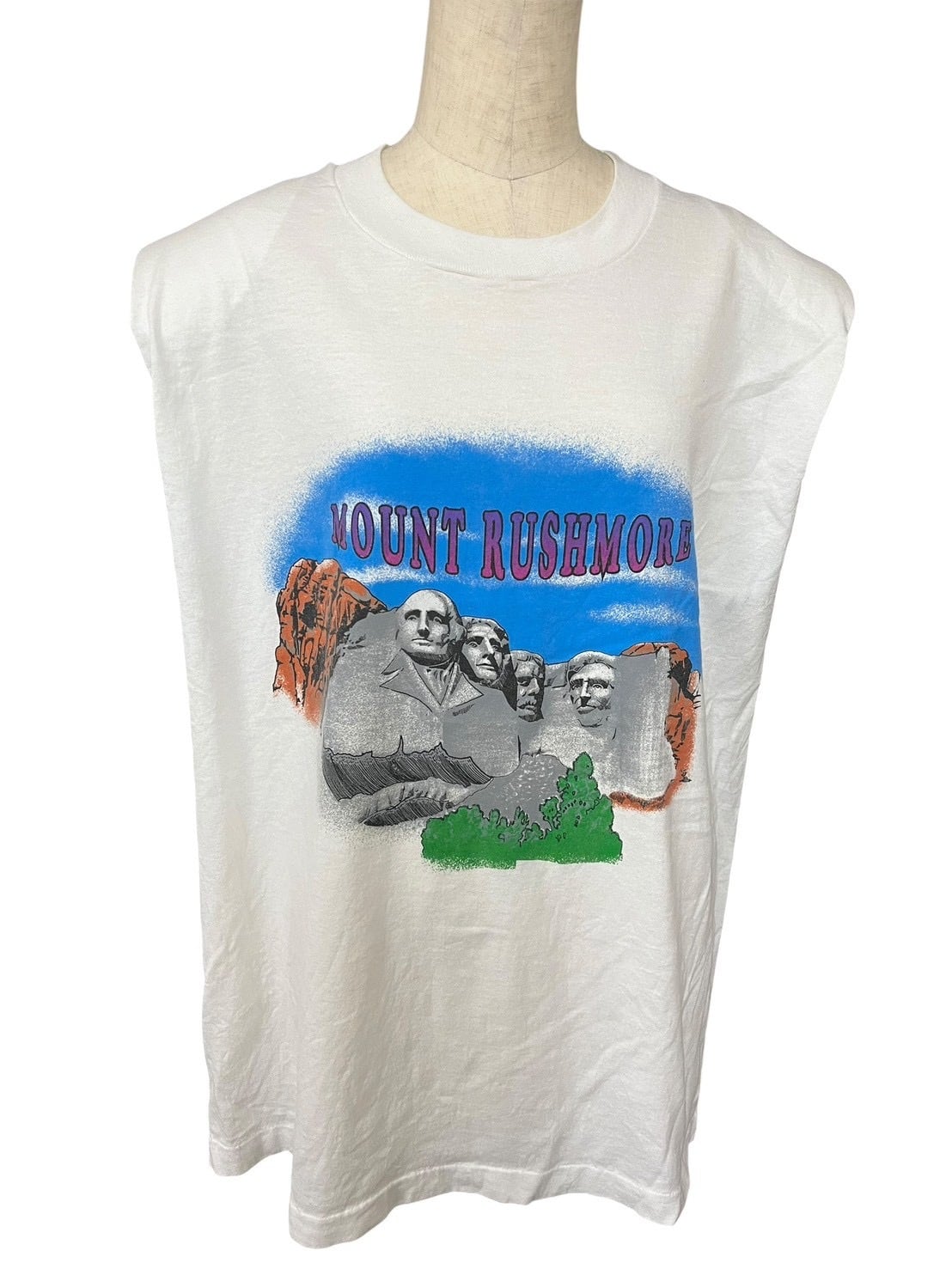 マウントラッシュモアをモチーフにしたヴィンテージグラフィック。フロントには大統領の彫刻を、バックにはその“裏側”をユーモラスに描いた遊び心のある両面デザイン。