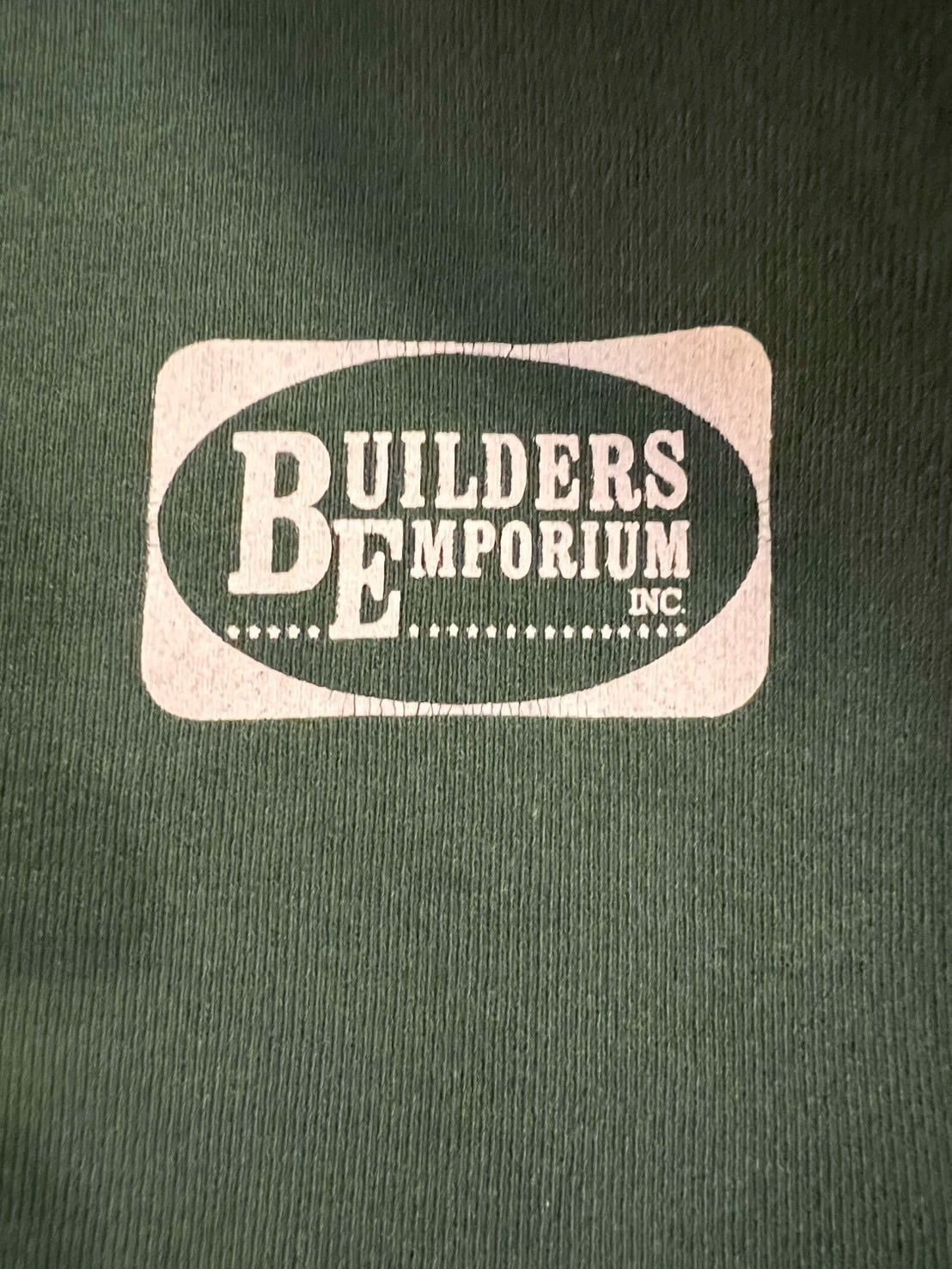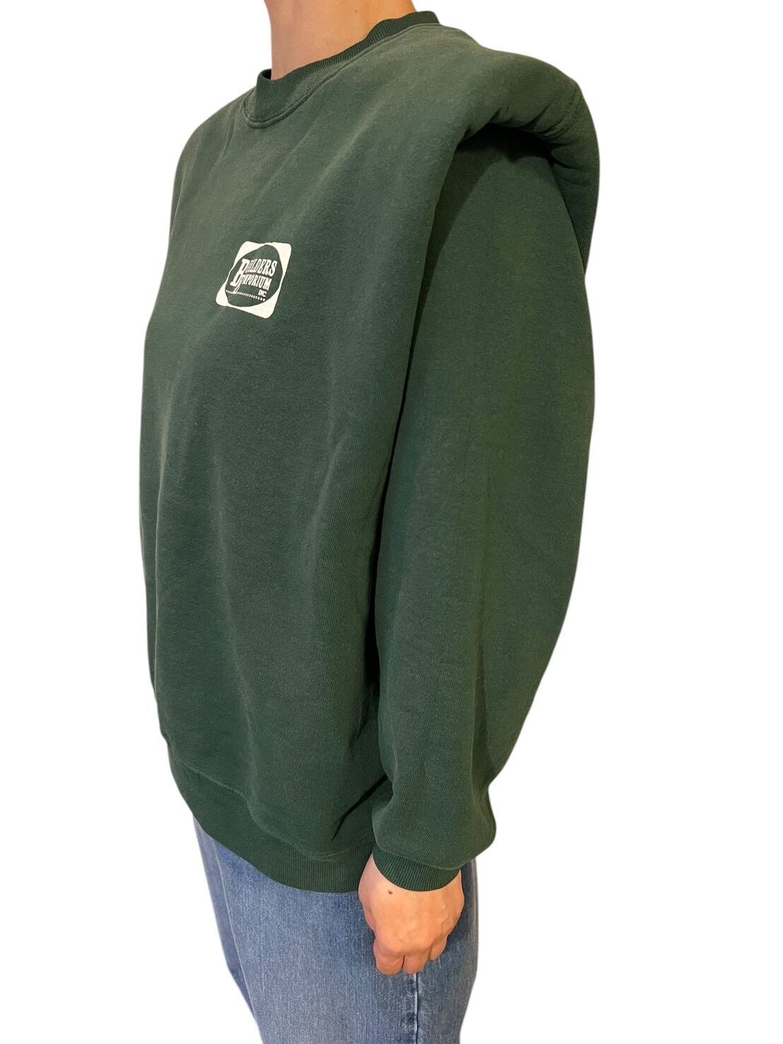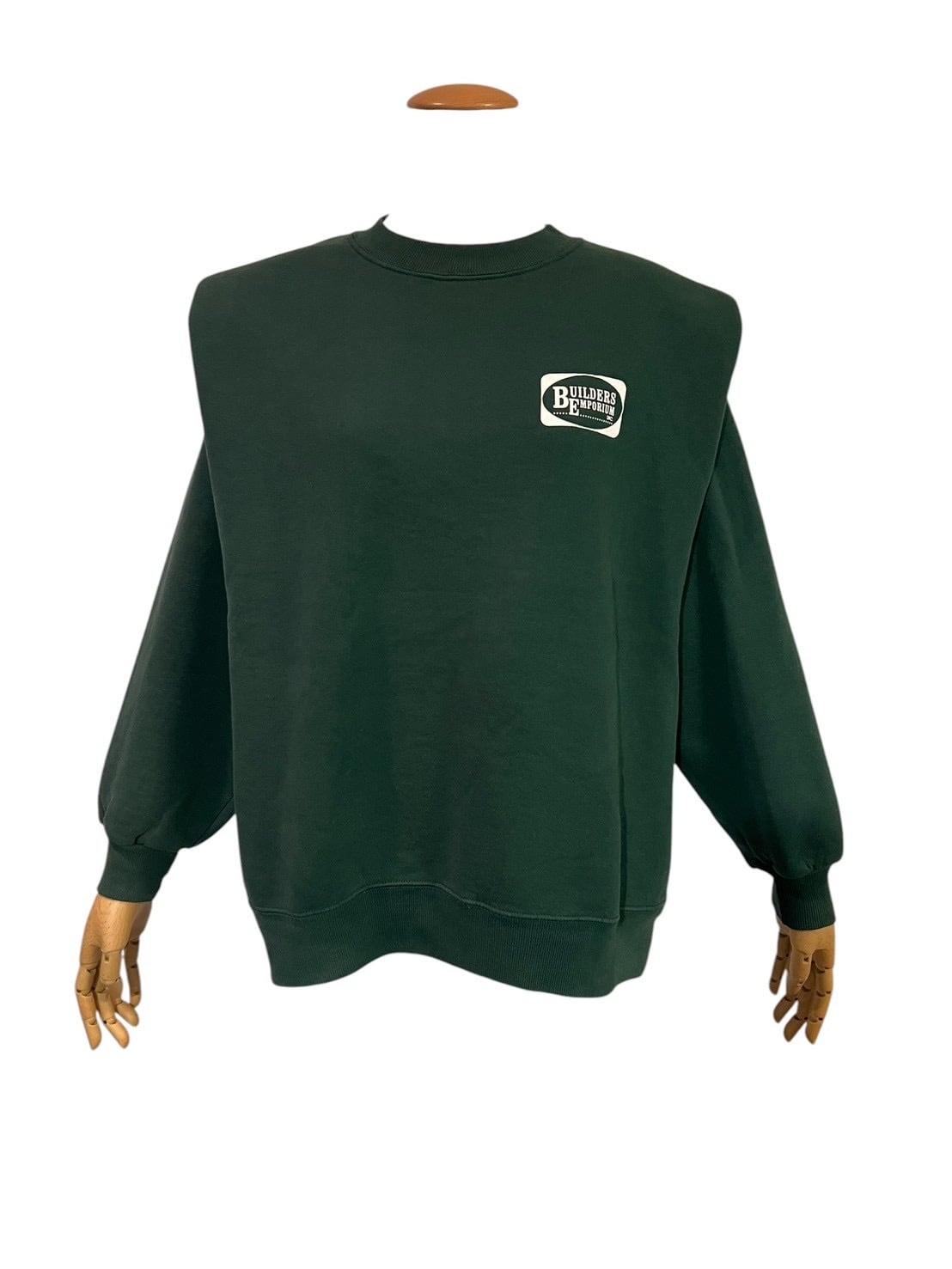 深みのあるグリーンボディにワークテイストのプリントを配したスウェットを、構築的なパワーショルダー仕様に再構築。無骨さとシルエットの強さが共存する一枚です。