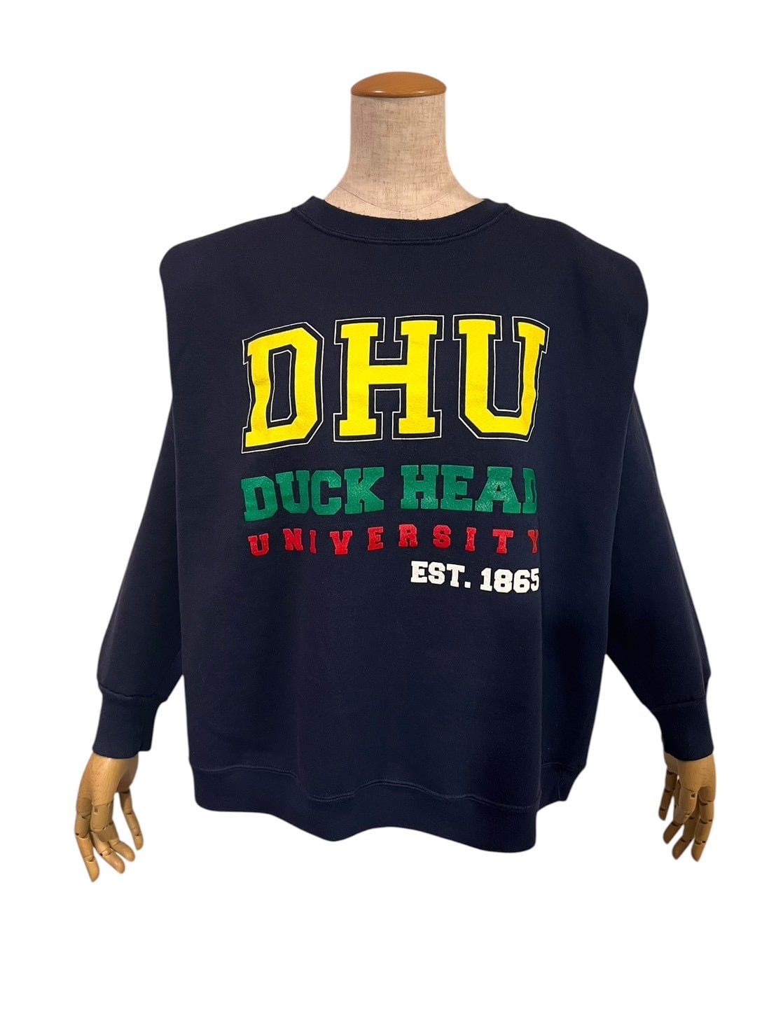フロントには「DHU」を中心に、「DUCK HEAD UNIVERSITY」「EST.1865」のレタリング。イエロー、グリーン、レッドの配色が映える、遊び心のあるカレッジデザインです。