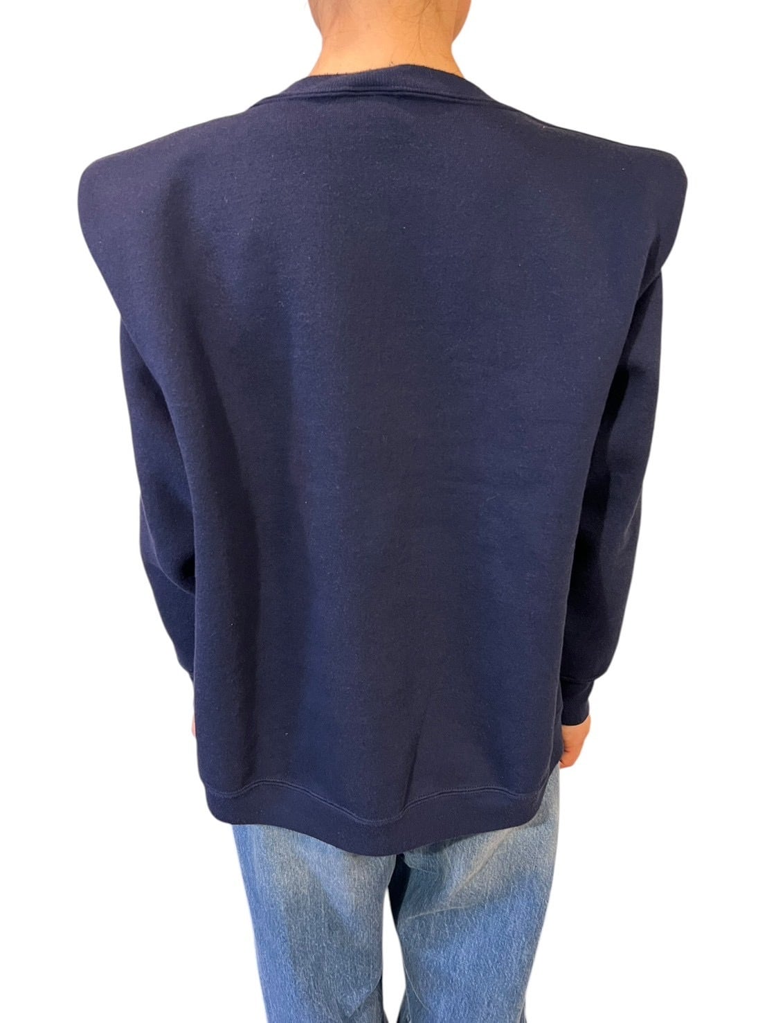 ネイビーボディにカラフルなカレッジロゴを配したスウェットを、構築的なパワーショルダー仕様に再構築。ポップなデザインに、直線的なシルエットでコントラストを加えた一枚です。