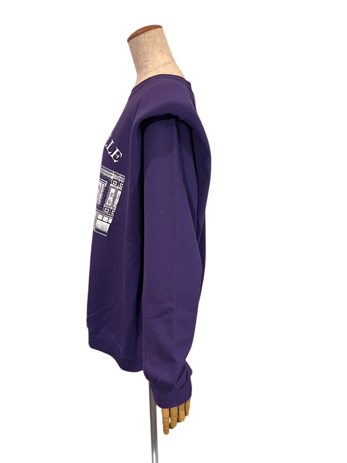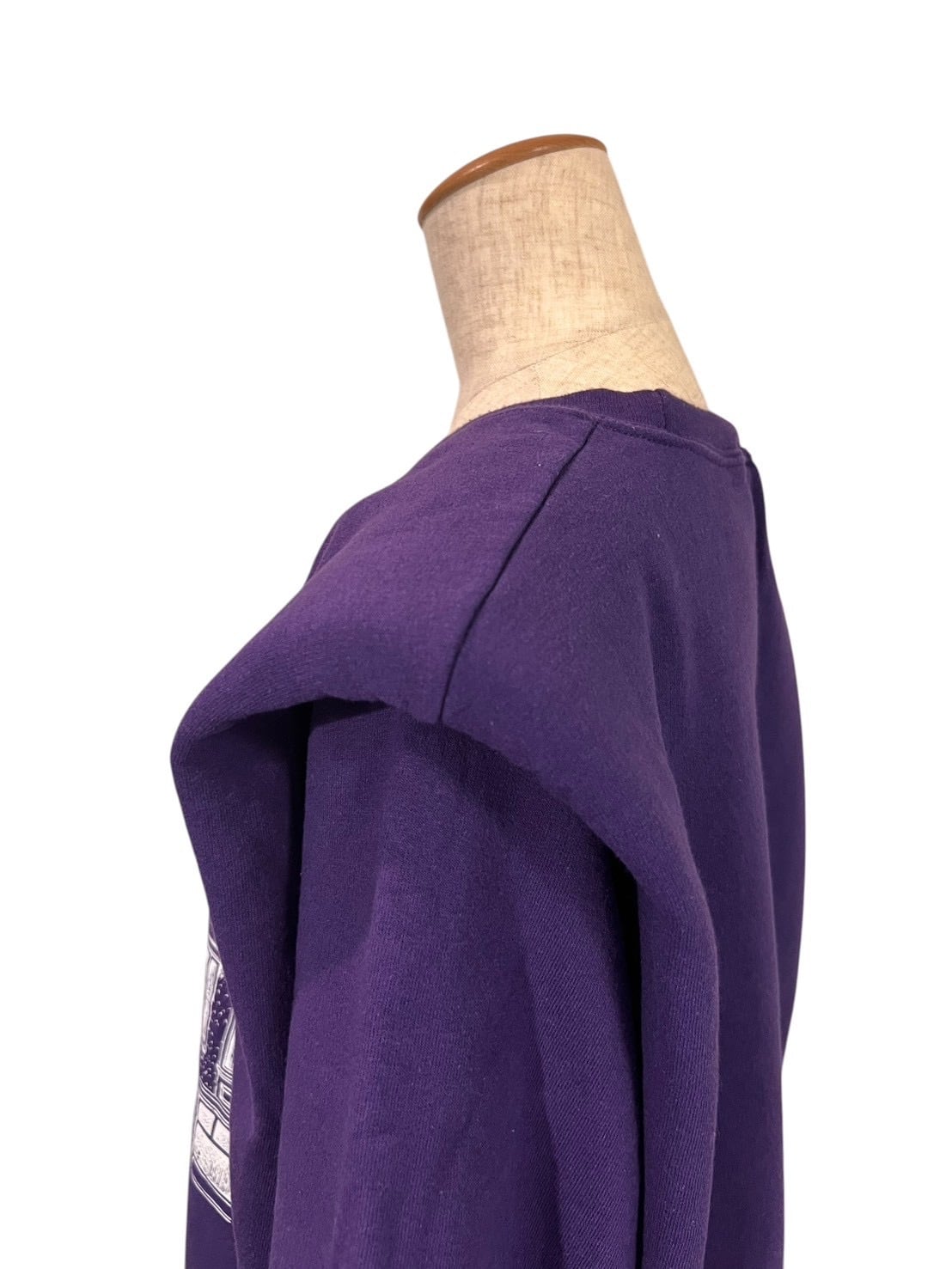 深みのあるパープルボディに、ローカルタウンの風景を描いたグラフィックを配したスウェットを、パワーショルダー仕様に再構築。柔らかな空気感のあるデザインに、直線的なシルエットで静かな緊張感を加えています。