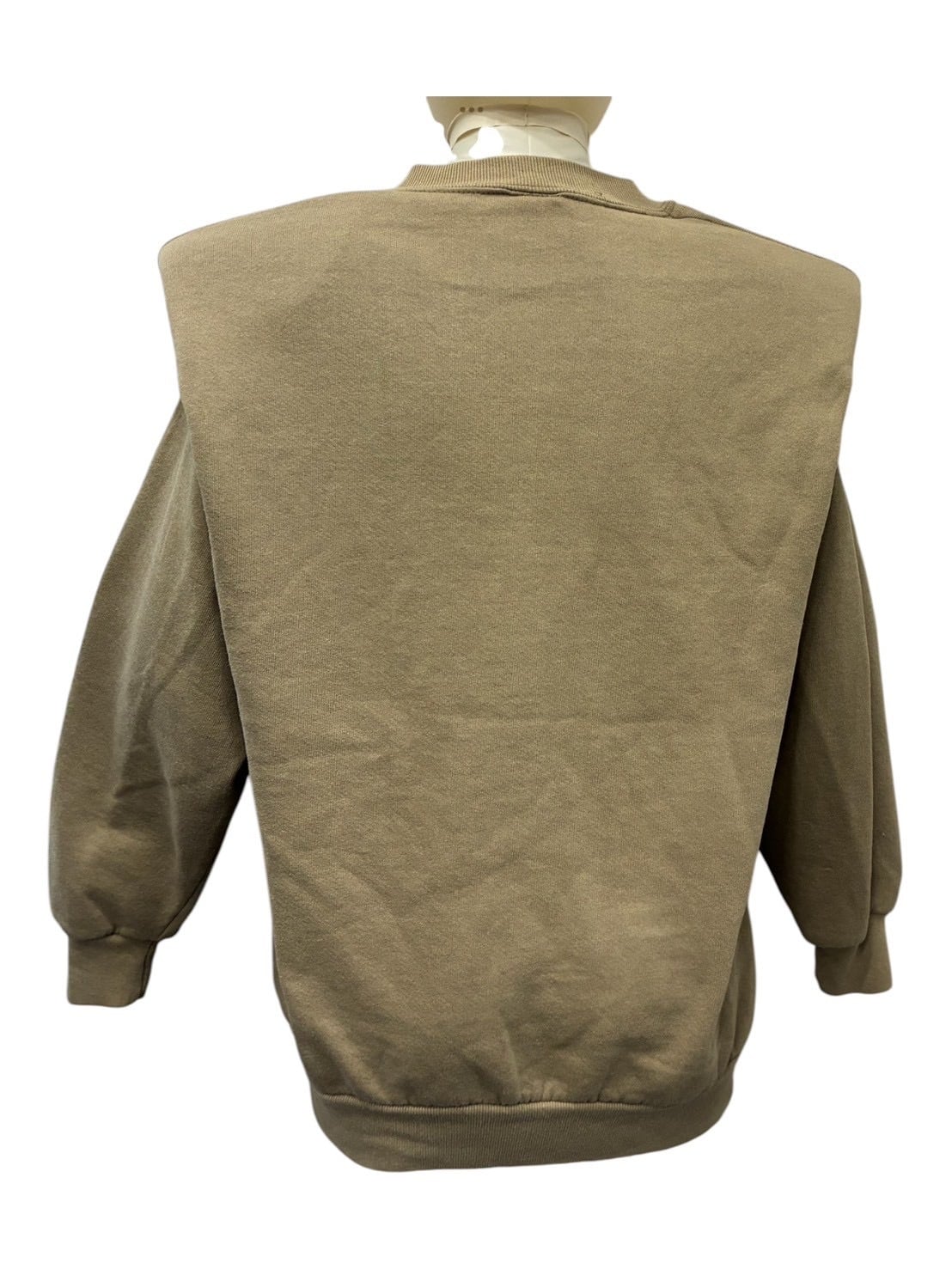 ベージュボディに色鮮やかなグラフィックを配したスウェットを、構築的なパワーショルダー仕様に再構築。穏やかなボディカラーに対して、プリントのコントラストが際立つ一枚です。