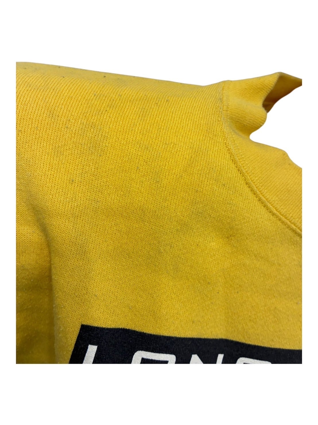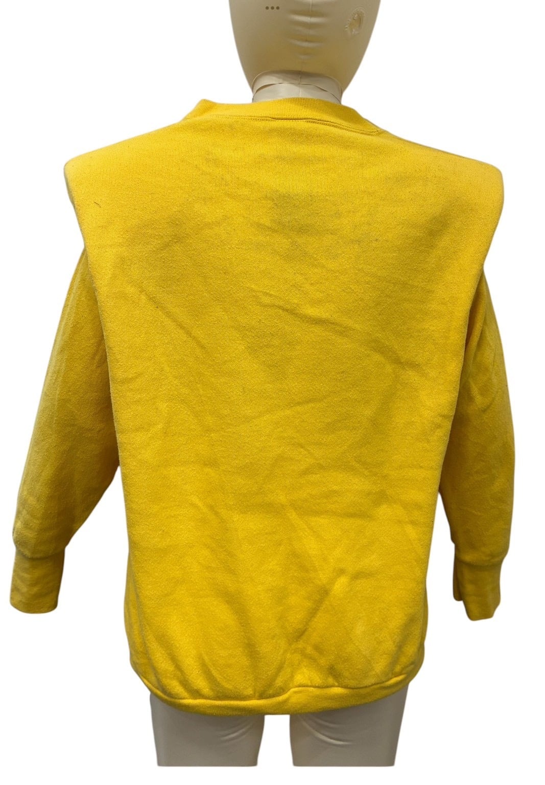鮮やかなイエローボディにグラフィックロゴを配したスウェットを、パワーショルダー仕様に再構築。視線を引きつけるカラーに、直線的なシルエットで輪郭を与えた一枚です。