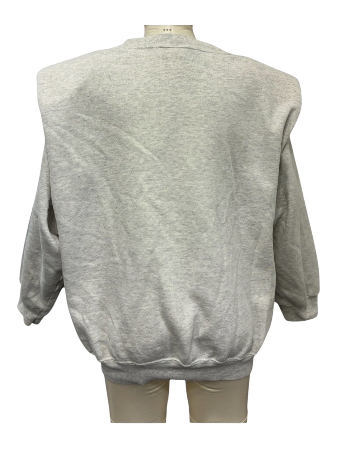 杢グレーのボディにフットボールモチーフを配したスウェットを、パワーショルダー仕様に再構築。クラシックなスポーツデザインに、シルエットでさりげない緊張感を加えています。