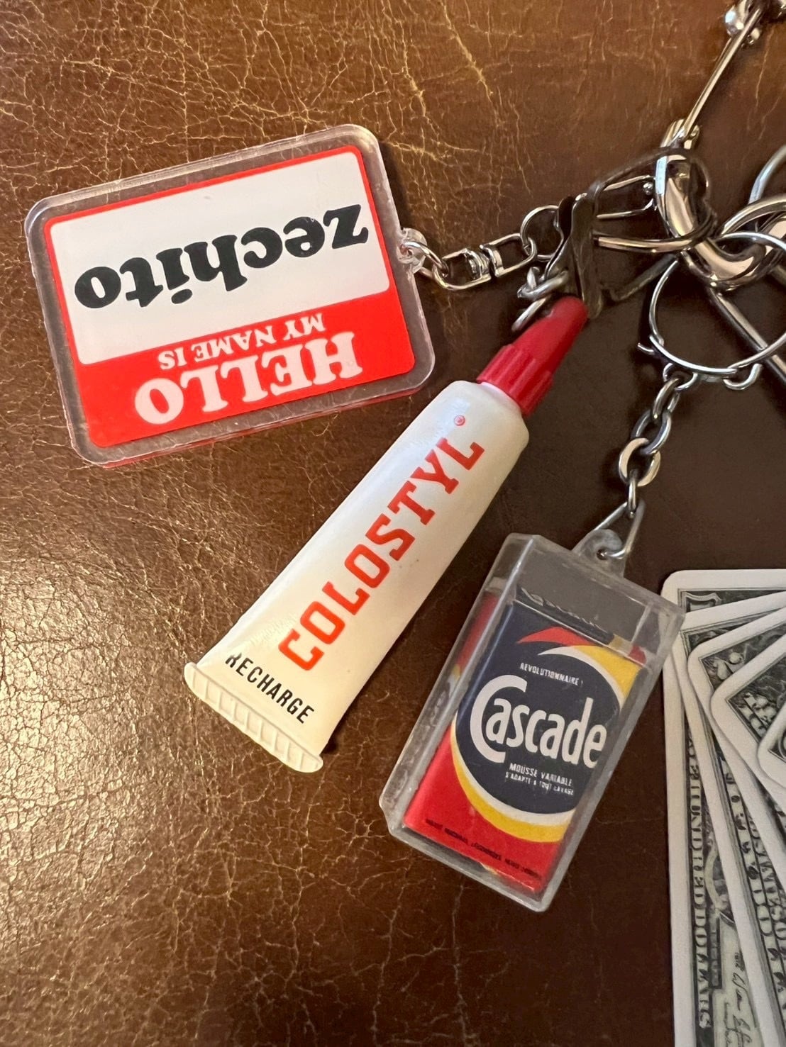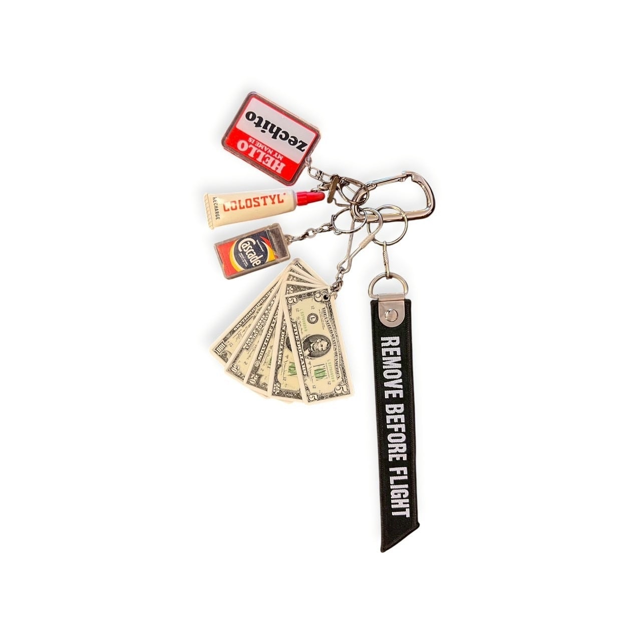 ドル紙幣モチーフを主役に、ヴィンテージのネームタグやミニボトル、チューブパーツを組み合わせたミックスチャーム。日常的なモチーフをラフに重ねた、アメリカンジャンクな雰囲気が魅力です。