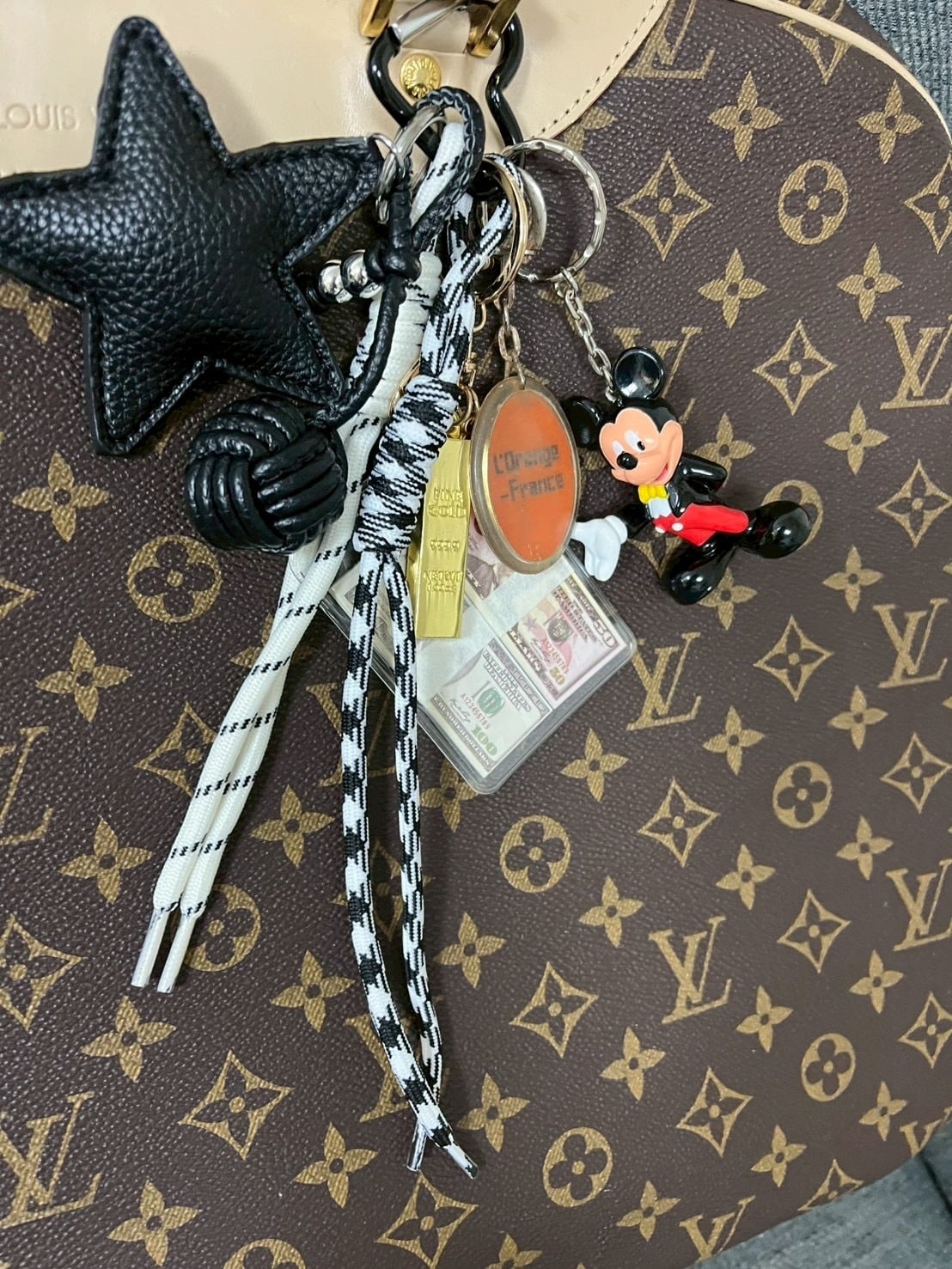ミッキーマウスやマネーモチーフ、ゴールドパーツを組み合わせたミックスキーチャーム。
