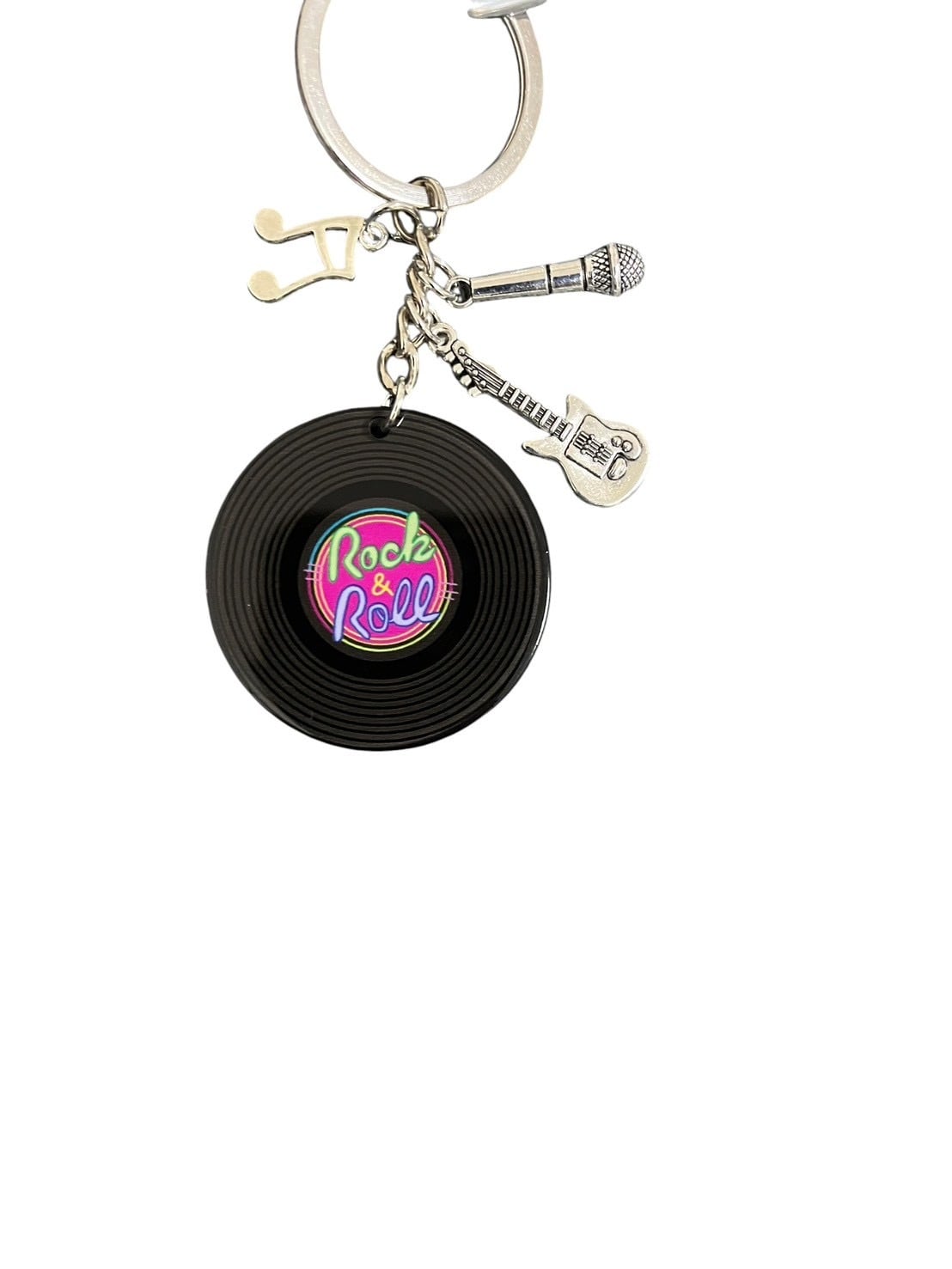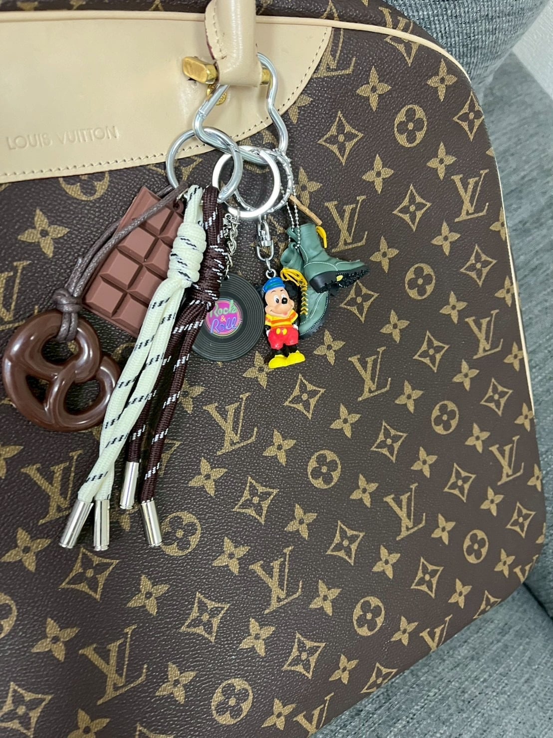 チョコレートやプレッツェル、レコード、ブーツ、ミッキーモチーフを組み合わせたミックスキーチャーム。