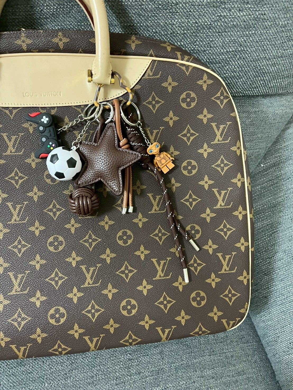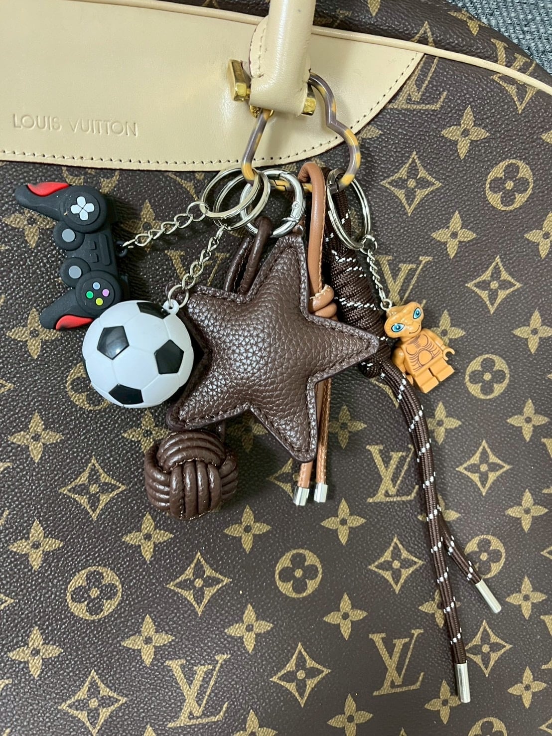 サッカーボールやゲームコントローラー、有名SF映画のキャタクターを組み合わせたミックスキーチャーム。
