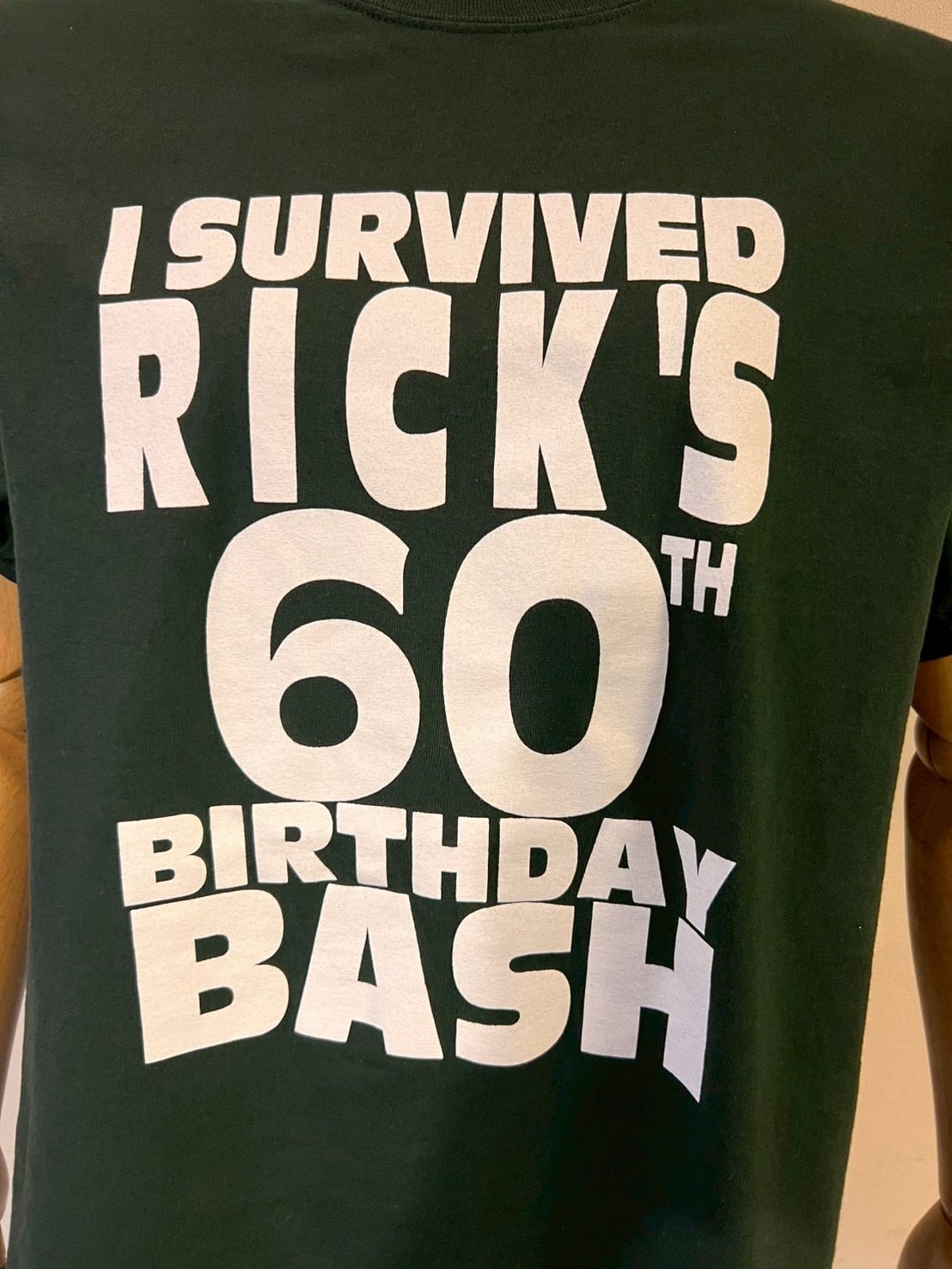 深みのあるボディに、“I SURVIVED RICK’S 60TH BIRTHDAY BASH”のメッセージプリント。誰かの60歳の誕生日パーティーを“生き延びた”という、アメリカらしいユーモアが効いた一枚です。