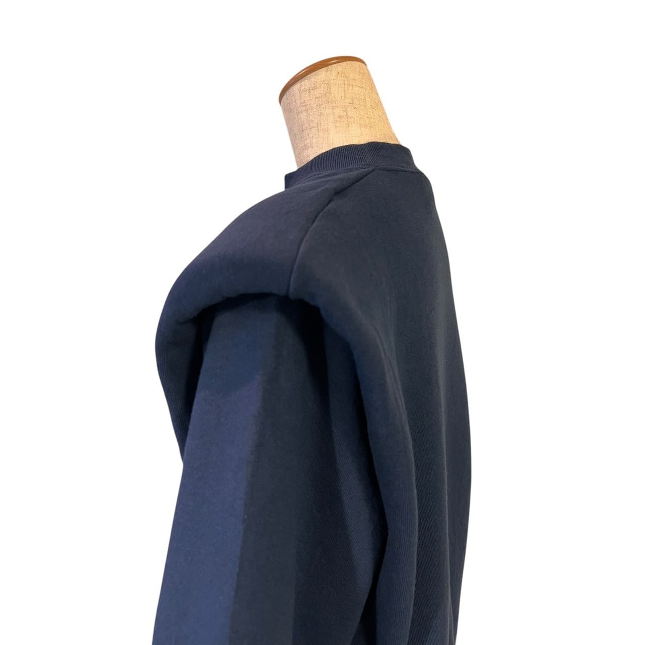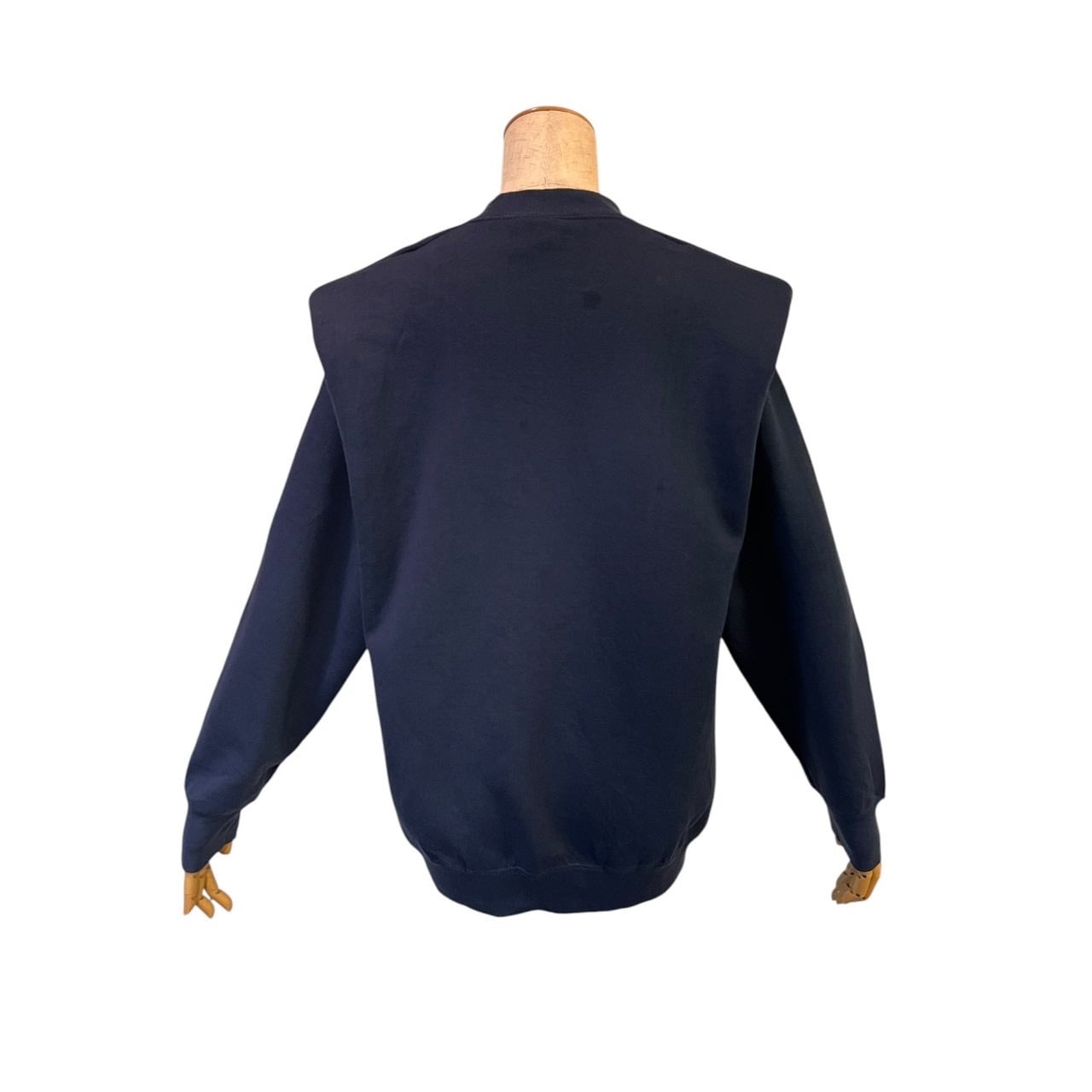 ネイビーボディにカレッジライクなグラフィックを配したスウェットを、パワーショルダー仕様に再構築。ベーシックな一枚に、シルエットで静かな強さを加えています。