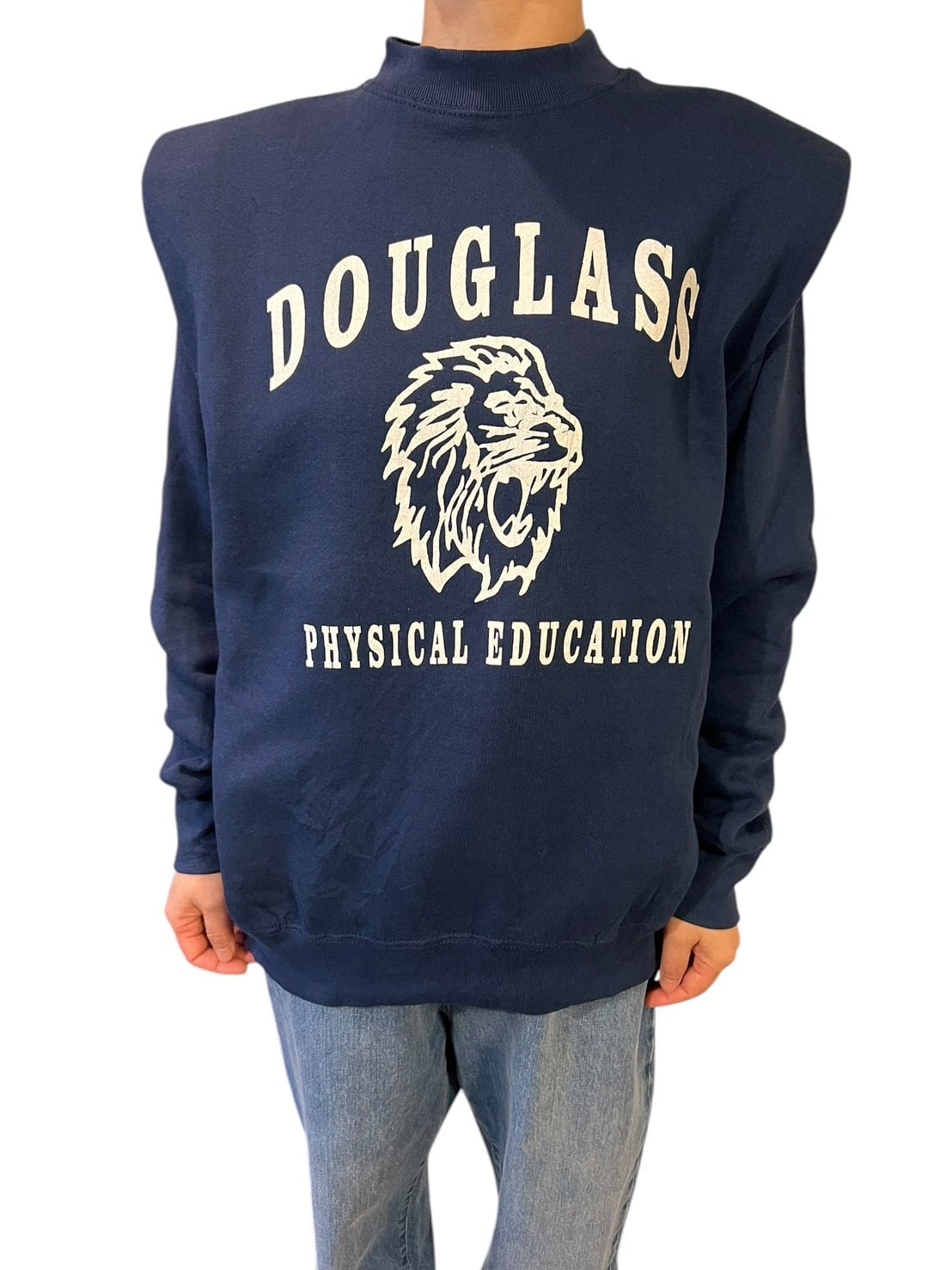 フロントには「DOUGLASS」のアーチロゴと、中央にライオンのモチーフ。「PHYSICAL EDUCATION」のレタリングが添えられ、クラシックなスクールウェアの雰囲気を感じさせるデザインです。