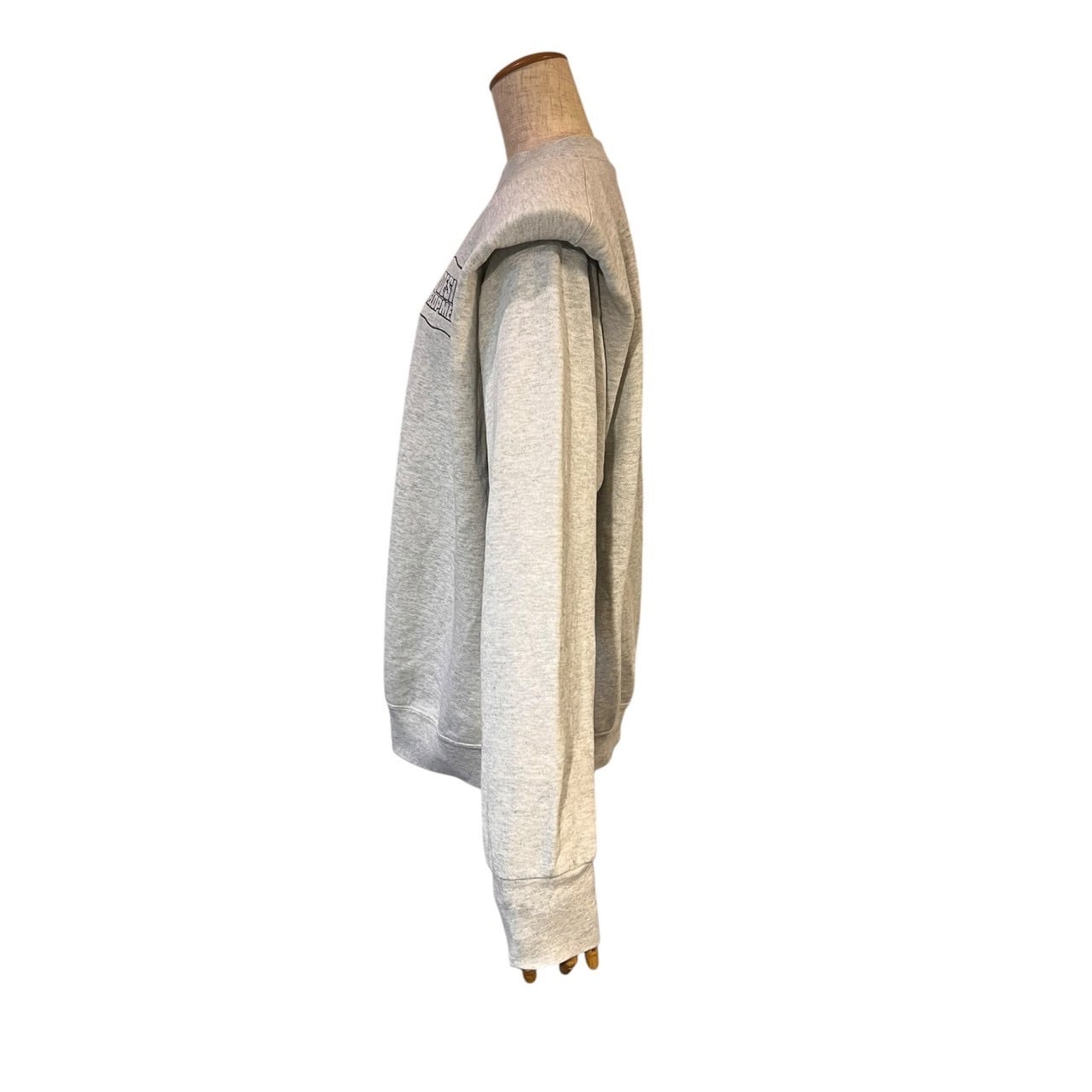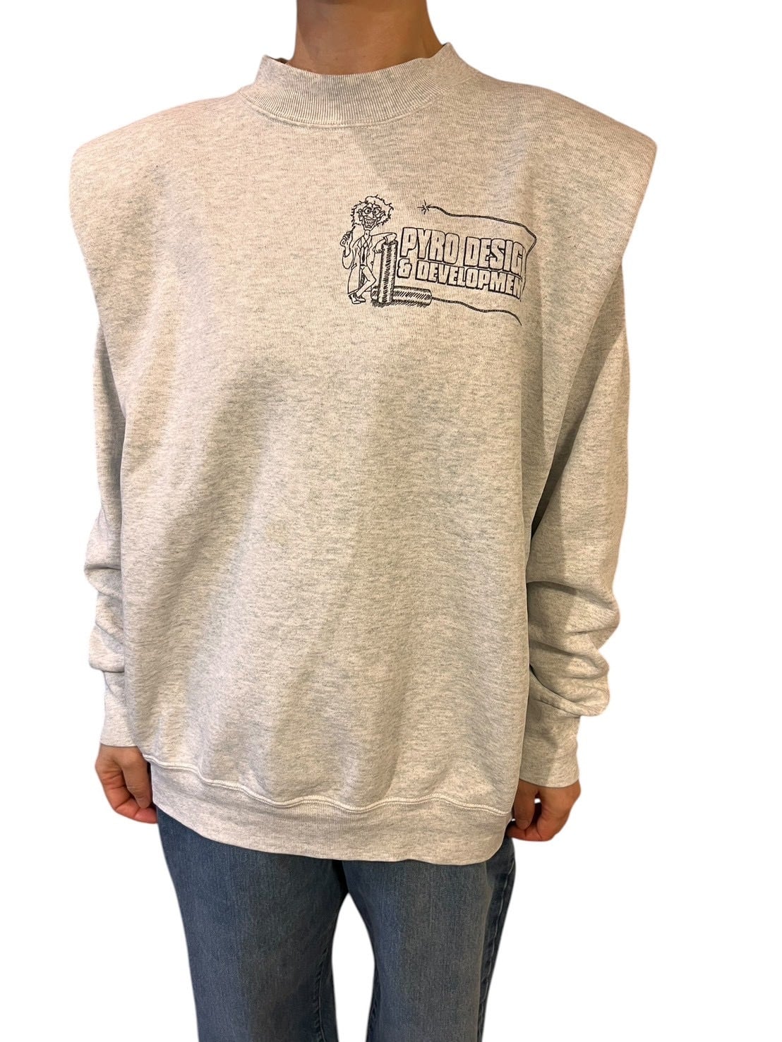 グレーボディのスウェットをベースに、パワーショルダー仕様へ再構築。無地に近い佇まいの中に、シルエットでしっかりと個性を出した一枚です。