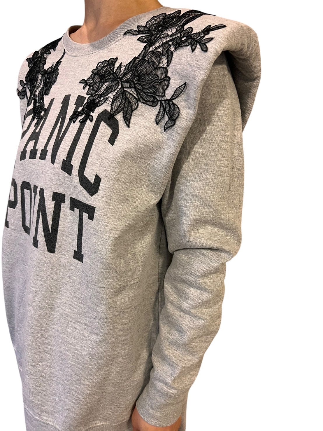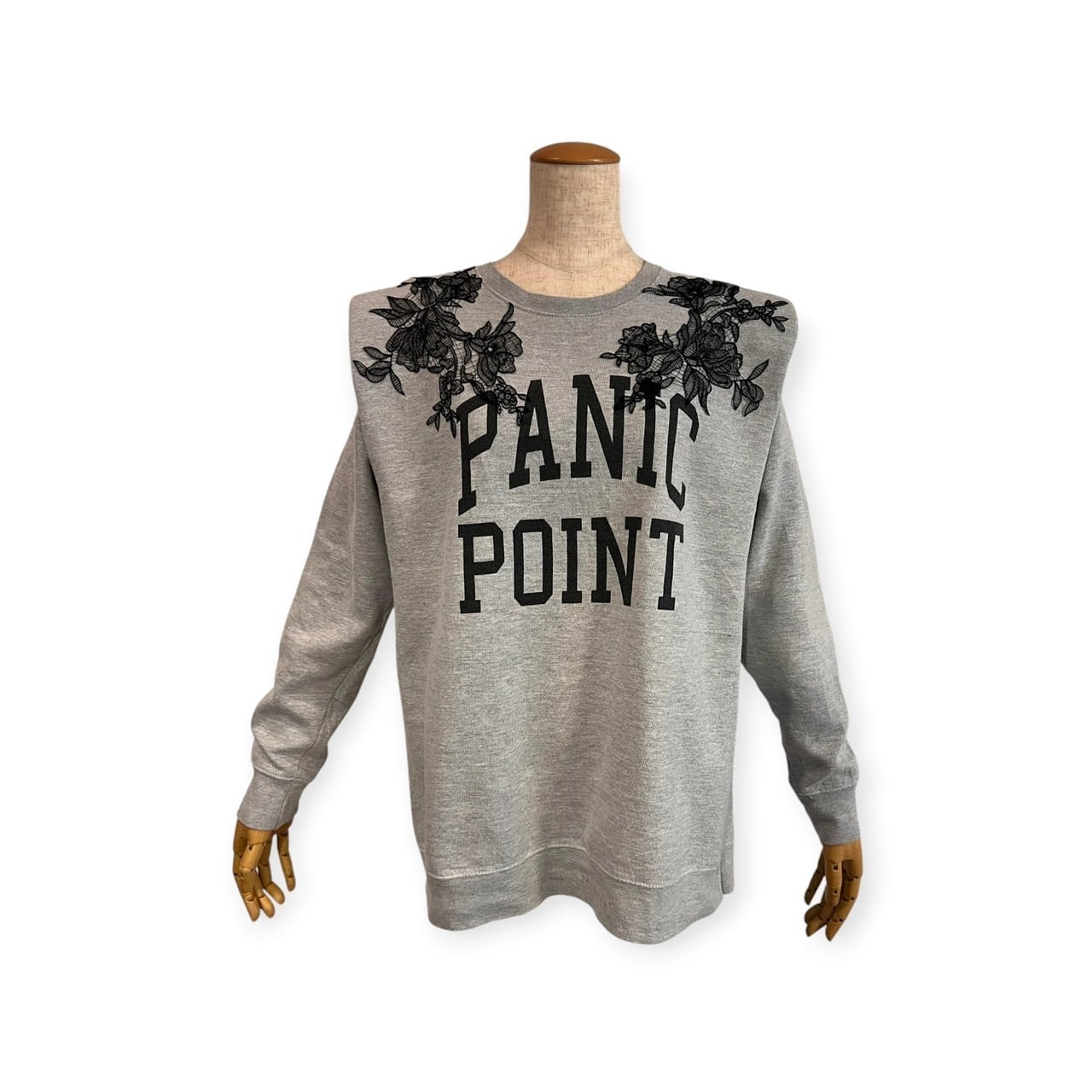 ネイビーボディをベースに、パワーショルダー仕様へ再構築したスウェット。