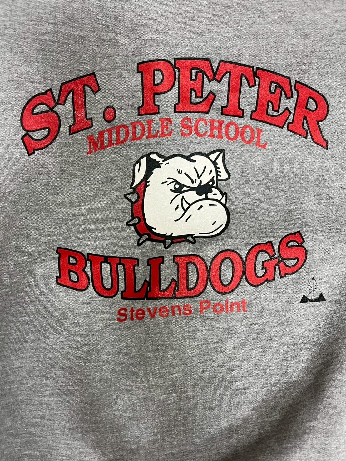 フロントには「ST. PETER MIDDLE SCHOOL」のカレッジロゴと、ブルドッグのグラフィックを配置。赤×ブラックの配色が効いた、スクールらしい力強さのあるデザインです。