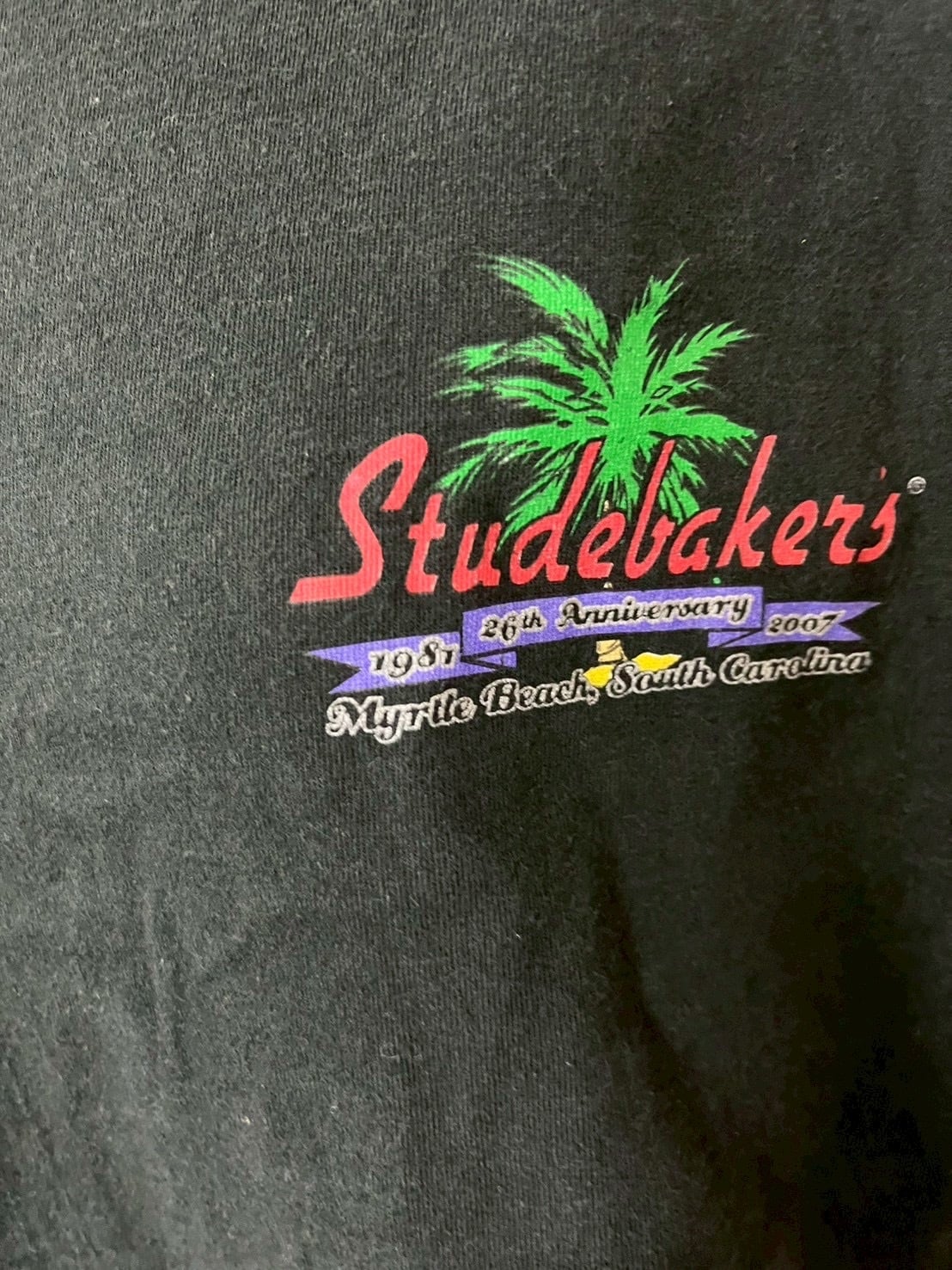 フロントはワンポイントで控えめに、バックには大きく配置されたStudebakerのアニバーサリーグラフィックが目を引くデザイン。ヤシの木と夕焼けを思わせる配色が、リゾート感のある軽やかな雰囲気を演出します。