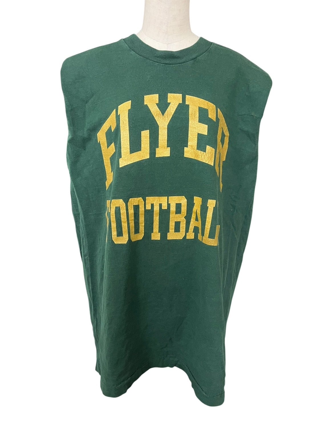 “FLYER FOOTBALL”のカレッジ調ロゴをフロントに配した一枚。グリーンボディにイエローのレタリングが映える、クラシックなスポーツテイストのデザインです。