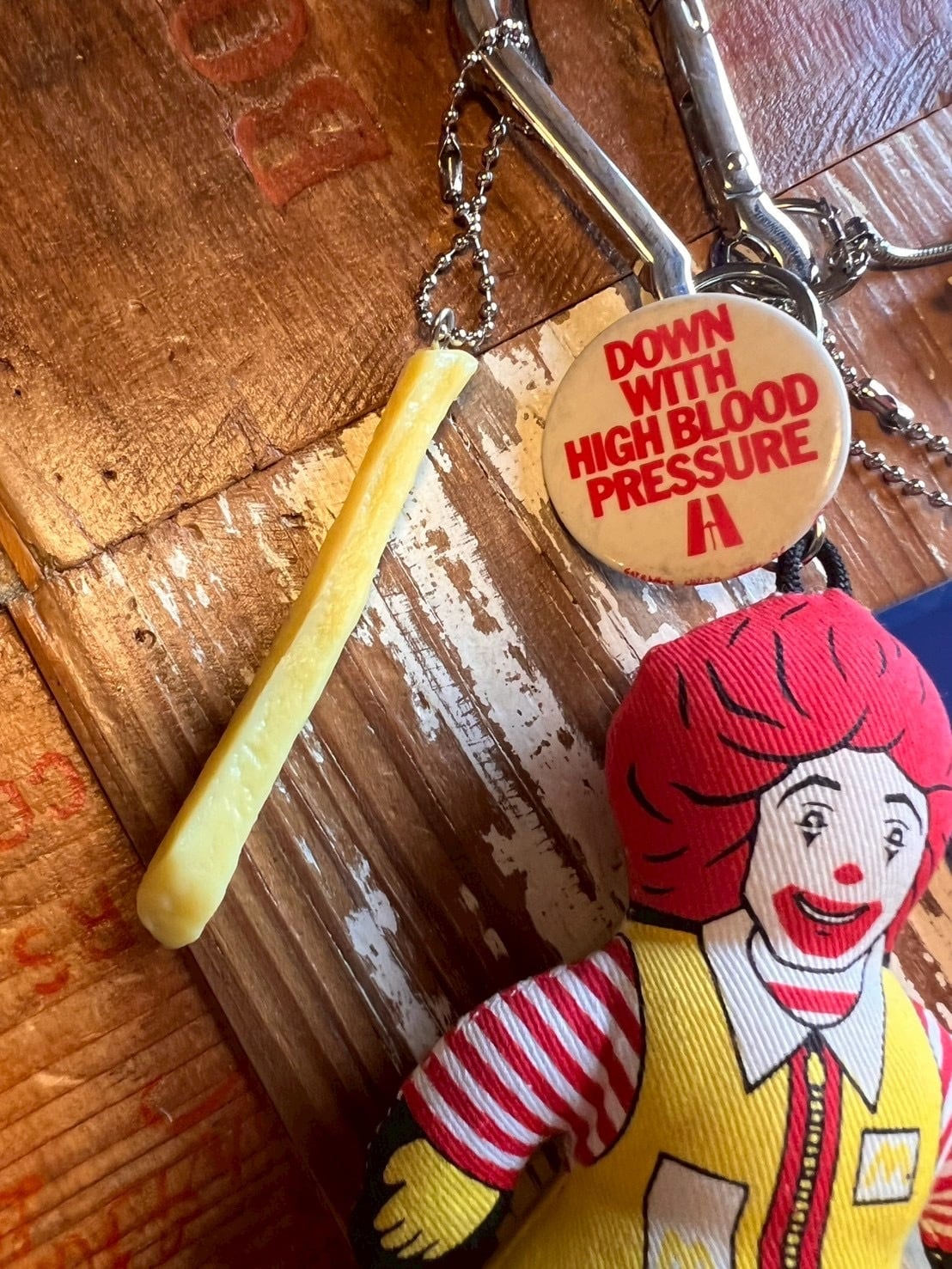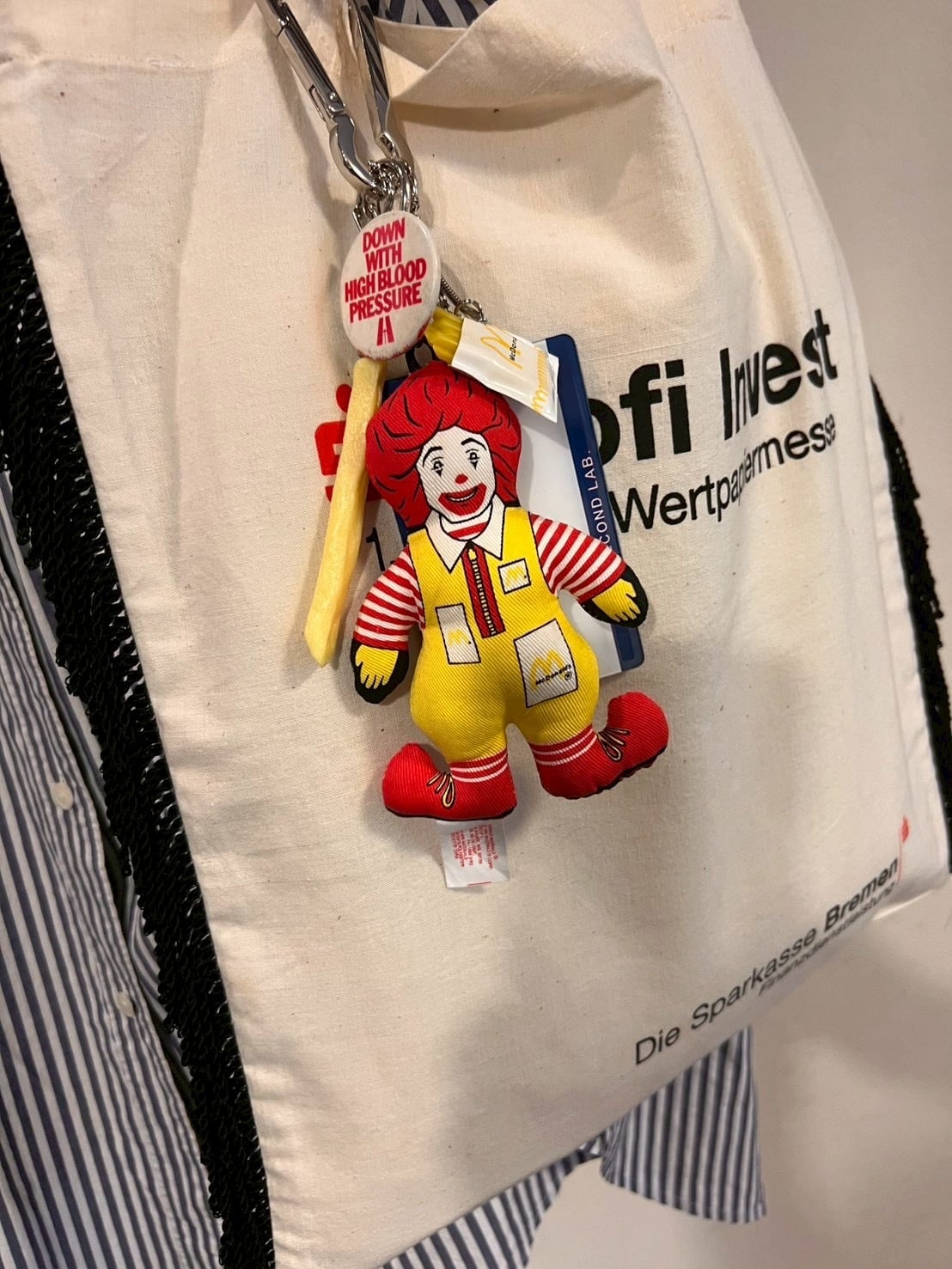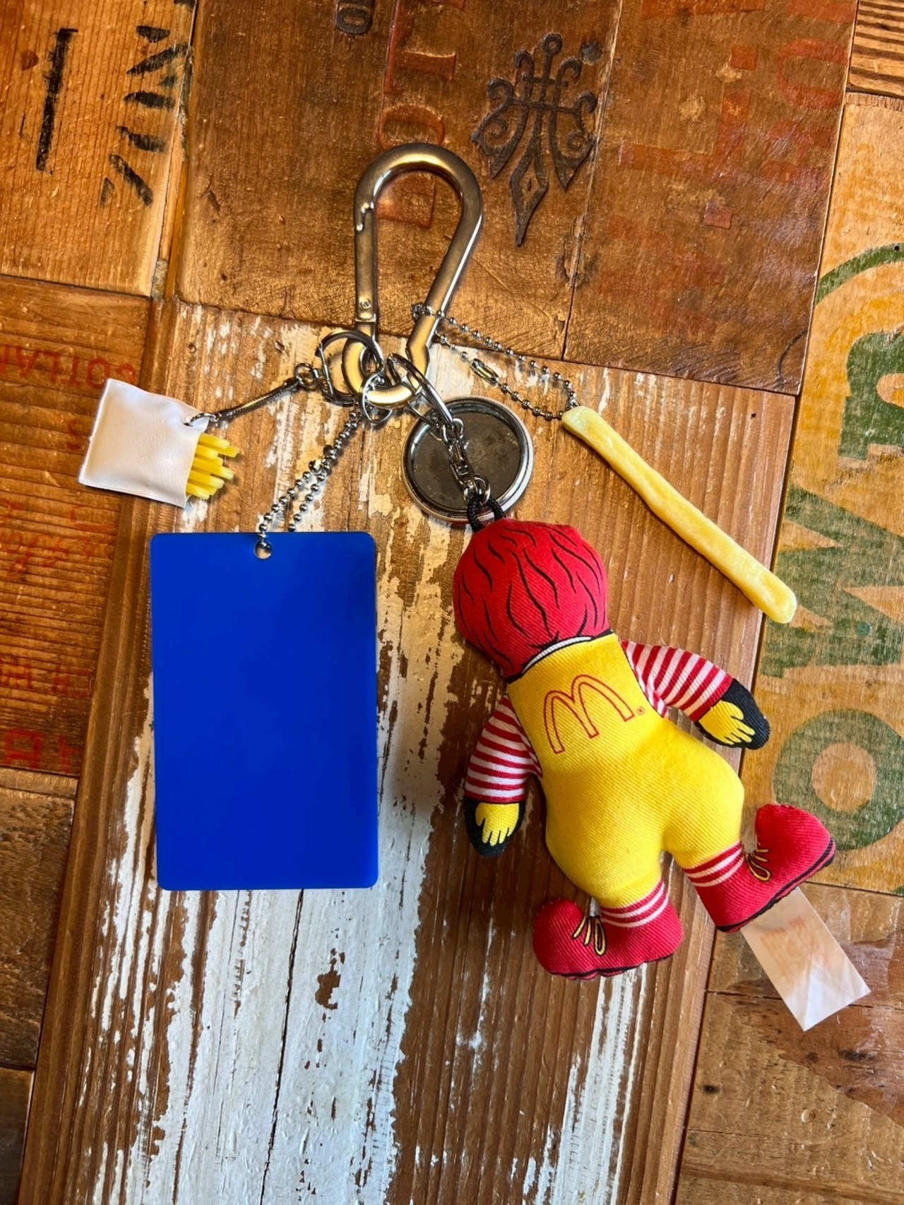 MCのロナルドを主役に、ポテトモチーフやヴィンテージのネームタグ、メッセージバッジを組み合わせたミックスチャーム。ポップでアイコニックなモチーフに、企業ノベルティのようなラフさを重ねたデザインです。