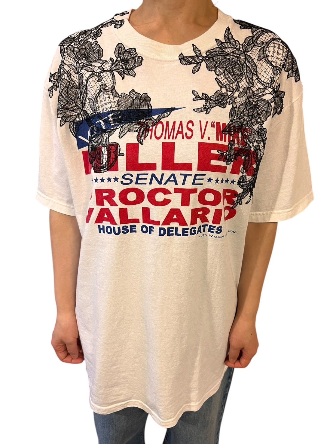 フロントにはアメリカの選挙キャンペーン風グラフィックを配置。レッド×ネイビーの力強いタイポグラフィに、繊細なレースが重なることで、ストリートとモードが交差する印象的なバランスに仕上がっています。
